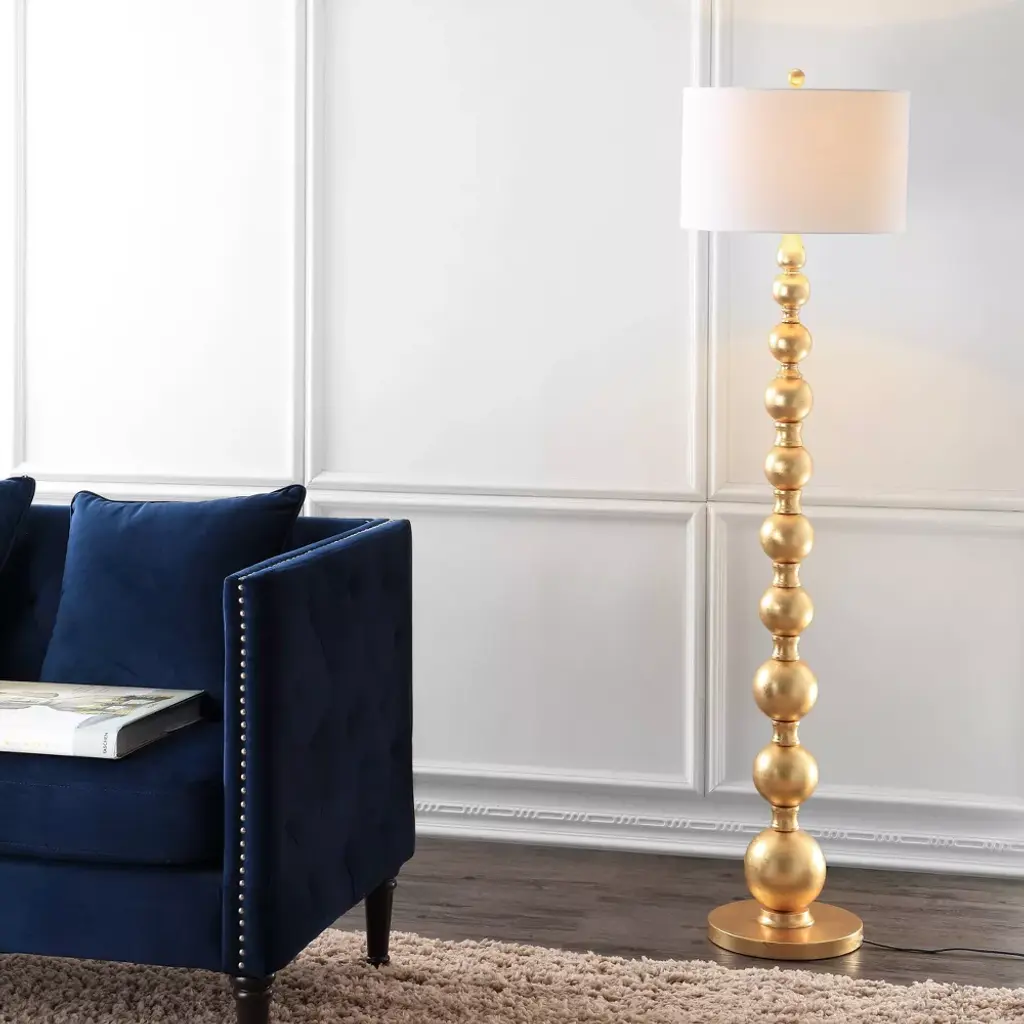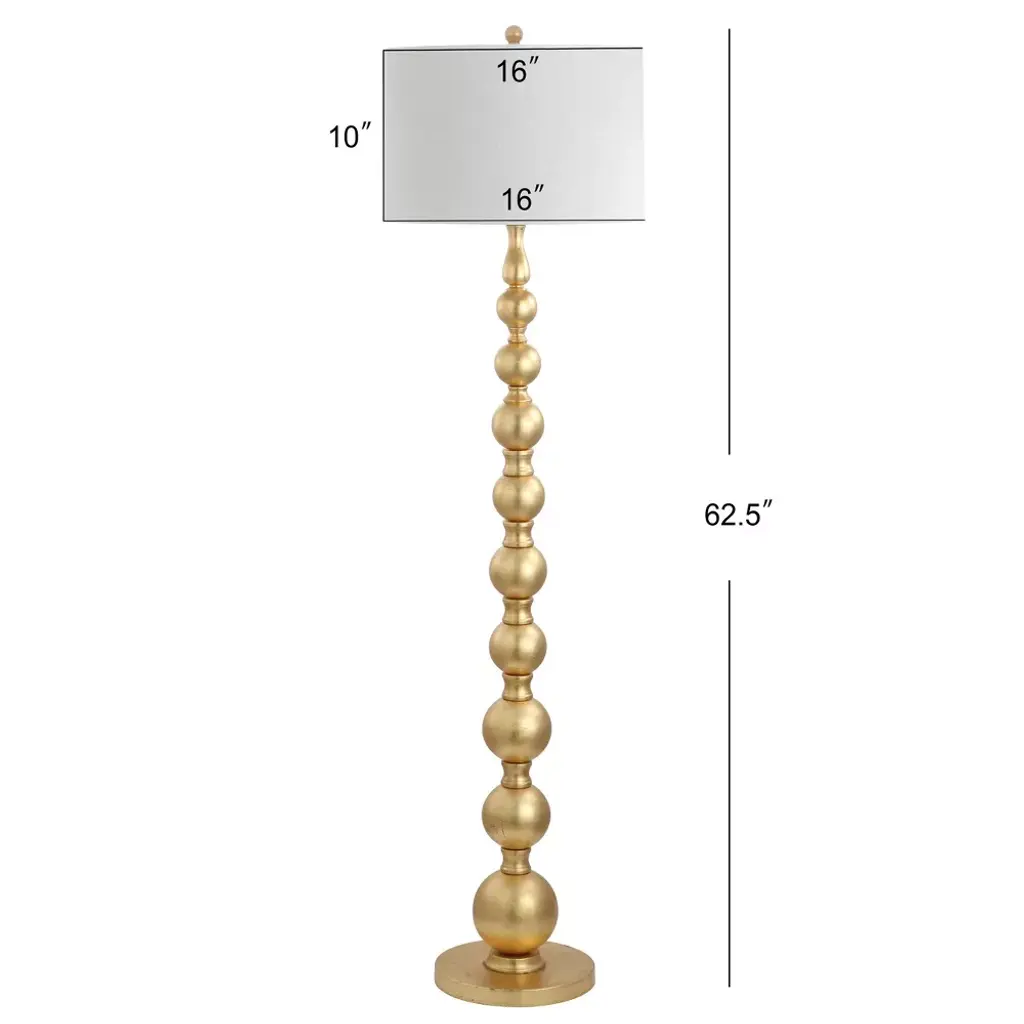 A cascading row of stacked gold balls forms the base of this floor lamp, giving any reading nook or living area a polished, contemporary look. A cotton shade keeps things casual, while the gold finish is decidedly glam. From the matching gold finial to the silk-wrapped cord, no design detail was overlooked in the creation of this statement-making piece.
