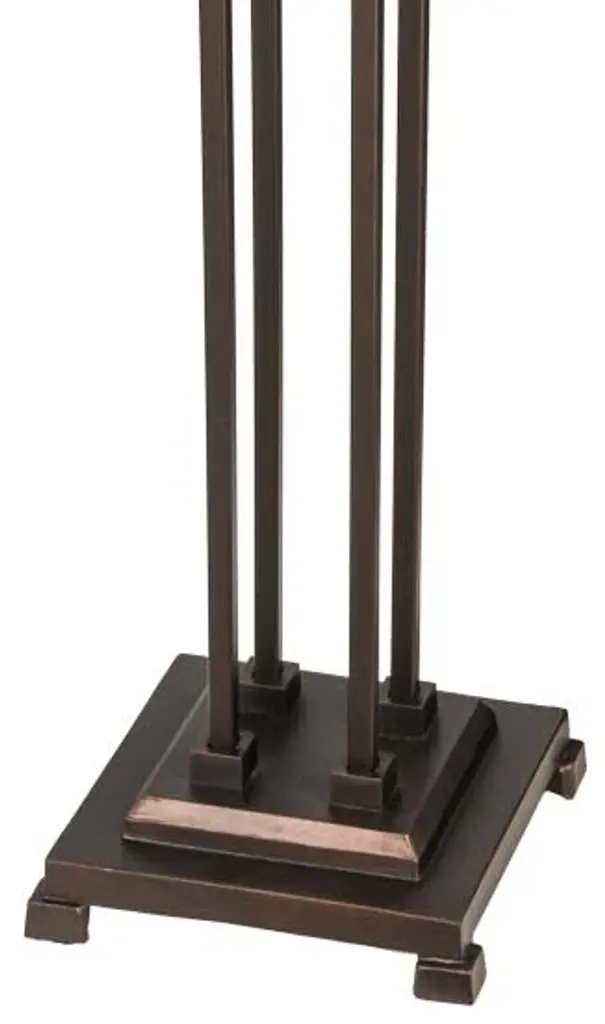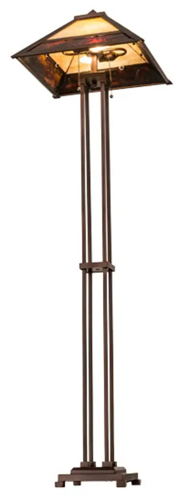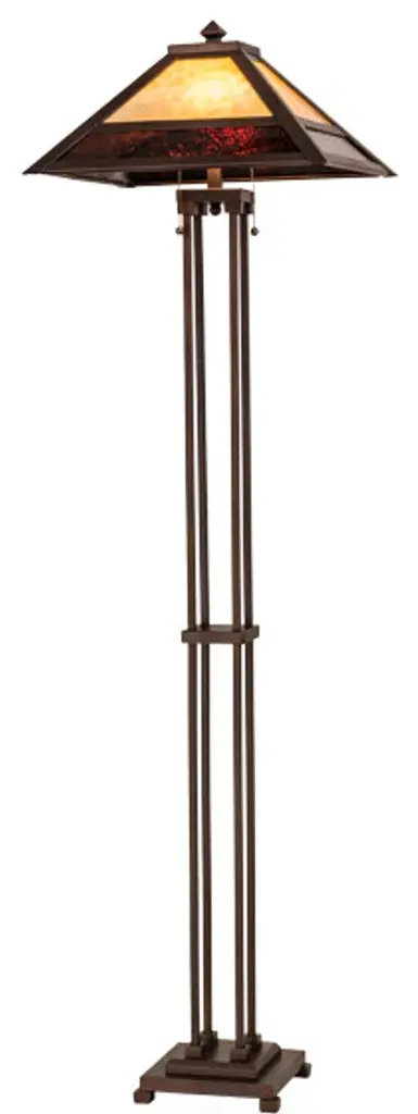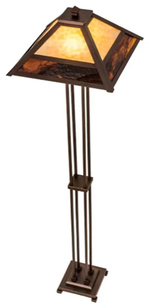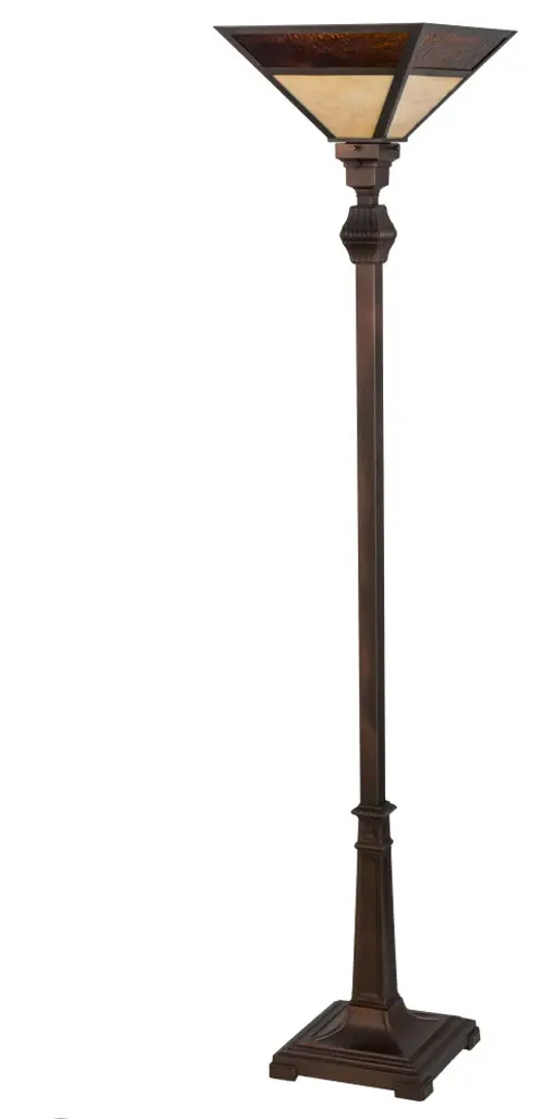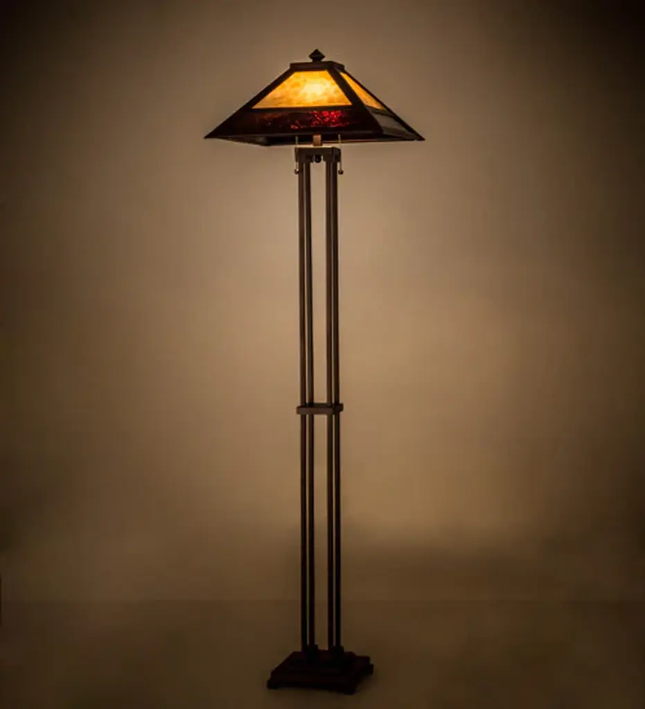 A stunning Mission styled lamp design inspired by the Arts & Crafts movement.A luxurious Beige art glass shade is trimmed with Root Beer glass and complemented with a Solid Brass frame.The decorative floor base is featured in a warm Mahogany Bronze finish.The lamp is the perfect illuminating accent for nearly any room and is available in custom colors; styles and sizes available.Energy efficient lamping options are offered. Handmade in the USA. UL and cUL listed for dry locations.