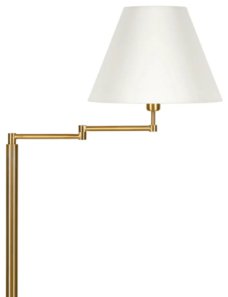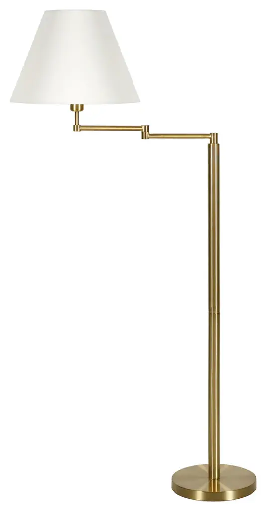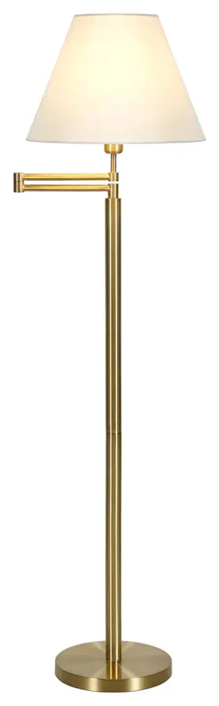This 62" brass swing arm floor lamp with white frosted glass empire shade is a great way to add some brightness to any corner of your home. The lamp is made of sturdy metal and features a brass color. The brass base coloring infuses a warm and rich tone to your space. The brass of this lamp creates a nice contrast with the white fabric empire shaped shade. A stationary base marries with a flexible swing arm that allows you to extend and move the light to where you need it. High quality design makes this a great lamp for not only lighting, but accenting a room with style. Bring some lite and good vibes into your space with this updated and stylishly designed lamp. 62" H x 26" W x 16" D