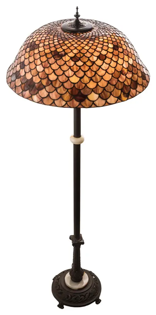 A Louis Comfort Tiffany studio classic. This Fishscale pattern is reproduced in variegated art glass of Honey dripped Amethyst and Citrine hues. The stunning shade is created using the famous Meyda Tiffany copperfoil construction and enhanced with a Mahogany Bronze finished floor base. A versatile lamp to complement any color or style. UL and cUL listed for dry locations. Each shade is a unique work of art with color variations based on natural ingredients inherent in the glass. Contact us if color matching is critical when ordering multiple items.