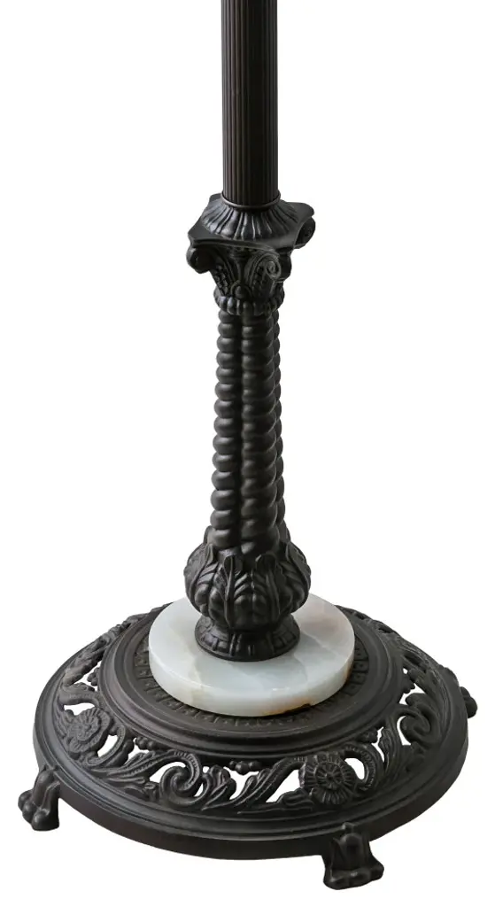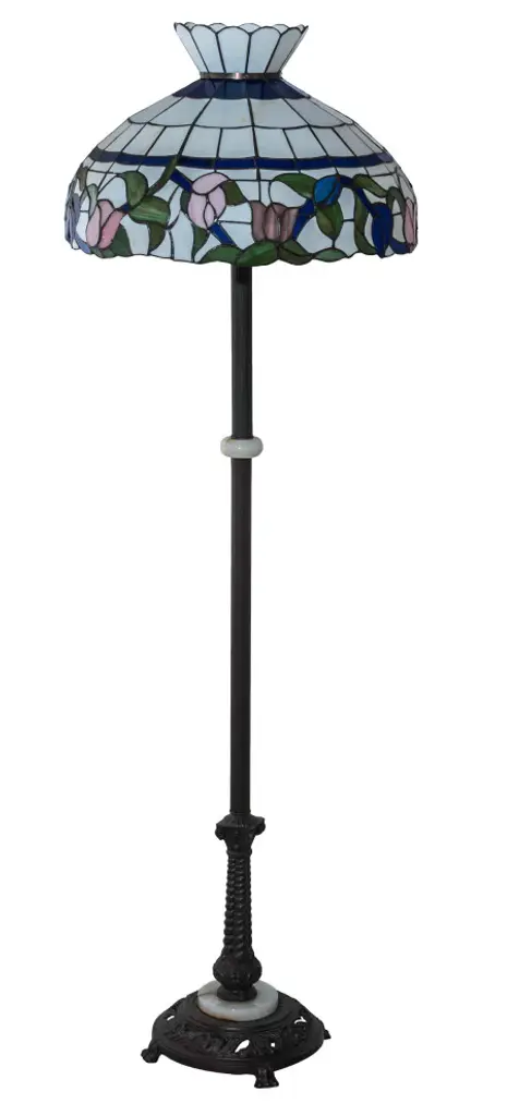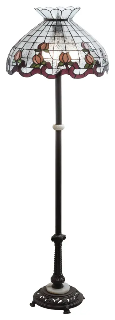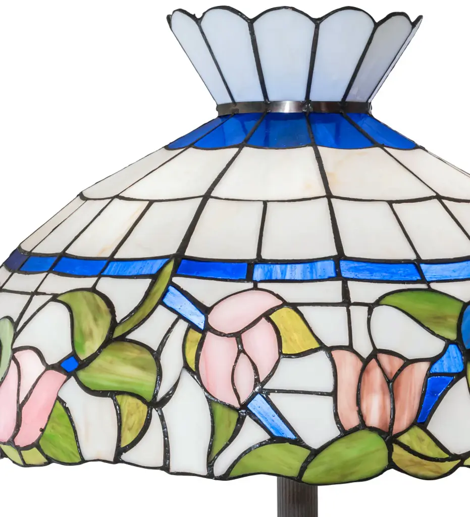 Colorful blooming roses in shades of Pink and Mauve circle a White trellis of glass; accented by ribbon; vines and buds in Blue with Earthy leaves to complete the look of this stunning crowned shade. This beautiful stained glass shade is created using the famous Meyda Tiffany copperfoil construction process. The colorful shade is complemented with a Mahogany Bronze finished base. This exquisite floor lamp is UL and cUL listed for dry locations.