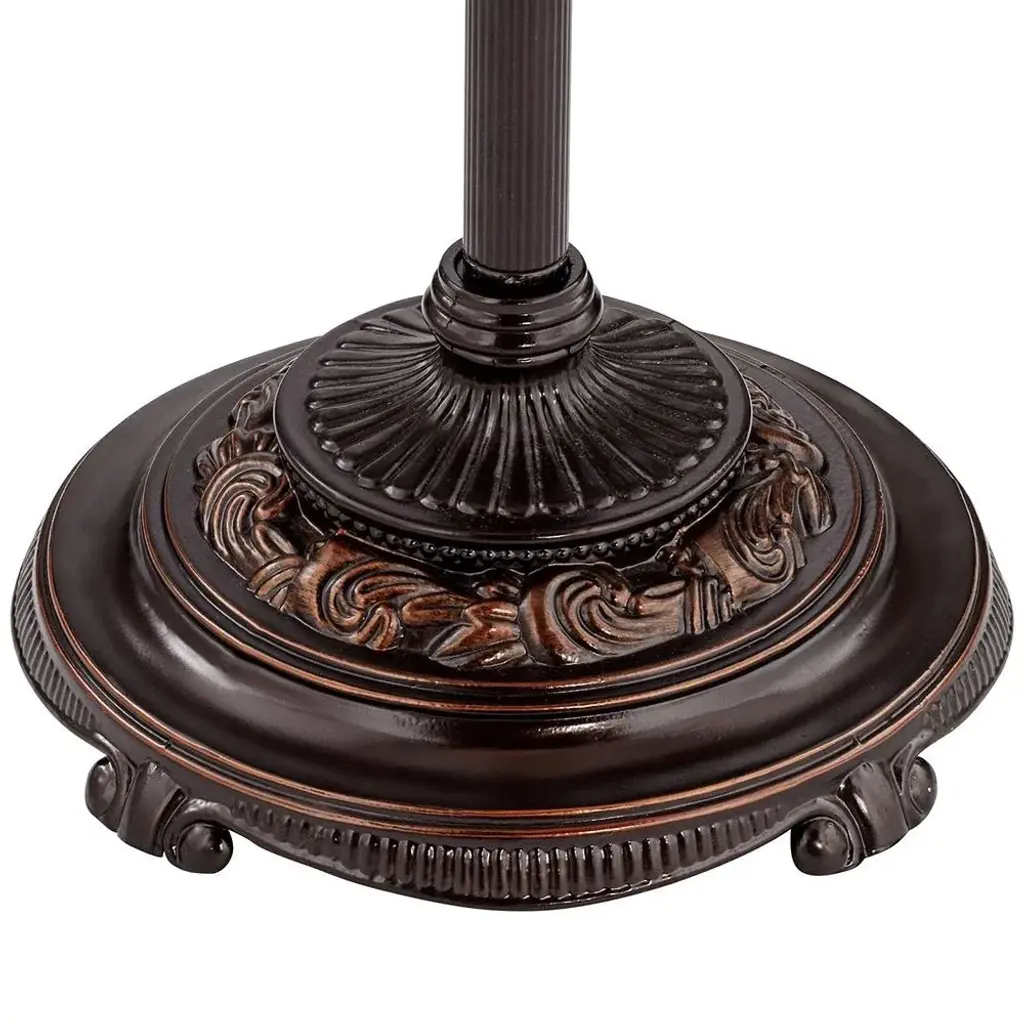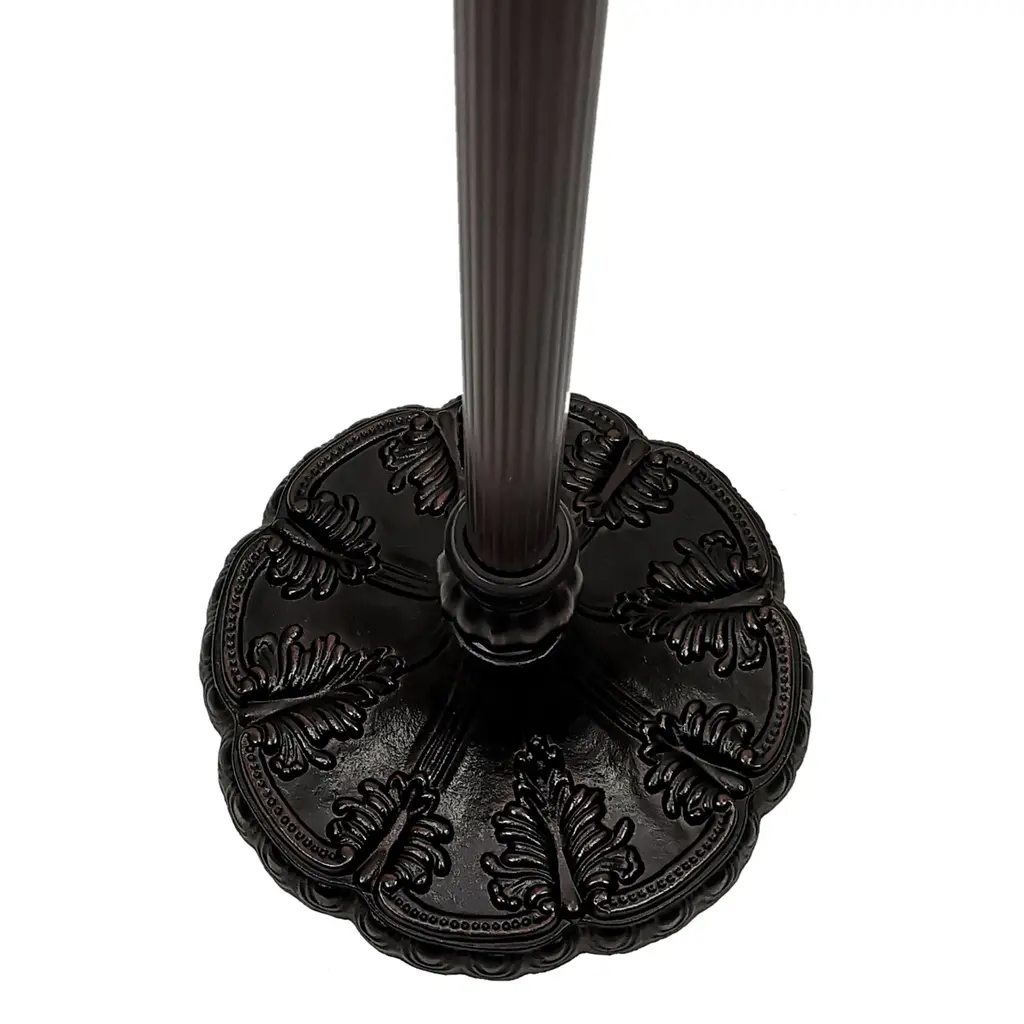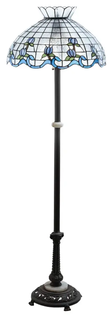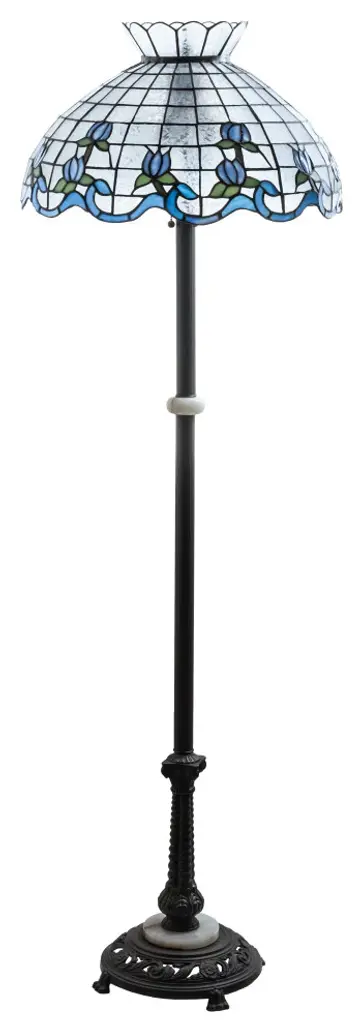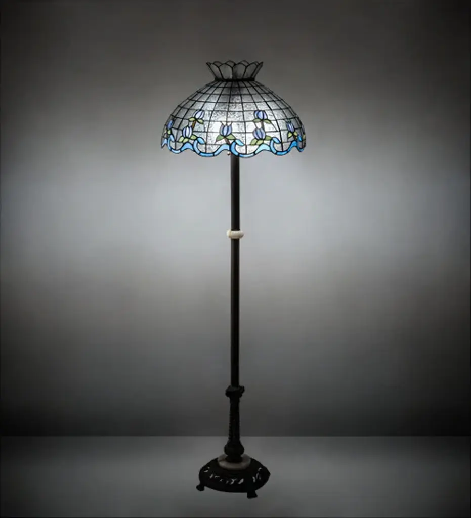 The Roseborder Floor Lamp features an elegant crowned shade highlighted with a gridwork of Winter-kissed Icy Clear Fern Glass adorned with a Sky Blue colored border of swirling ribbons and perfect Blue rosebuds accented with Green Leaf accents. Our Tiffany styled stained glass shade is created using the famous Meyda Tiffany copperfoil construction. The shade is paired with a handsome floor base featured in a Mahogany Bronze finish. UL and cUL listed for dry locations. Each shade is a unique work of art with color variations based on natural ingredients inherent in the glass. Contact us if color matching is critical when ordering multiple items.