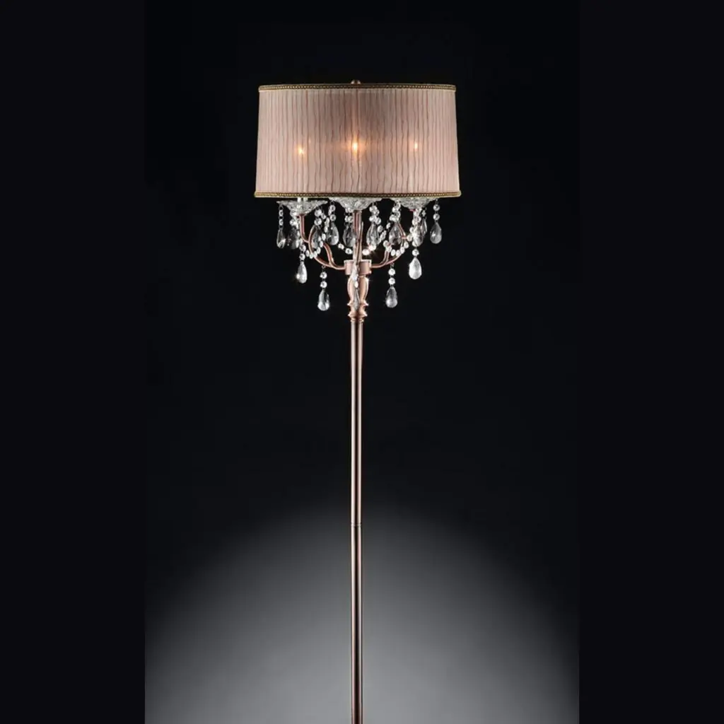 A floor lamp is the perfect blend of style and function, offering versatile lighting solutions for any room in your home. Whether you're looking to add ambient lighting to your living room, reading light beside your favorite chair, or an accent piece for your bedroom, a floor lamp provides both practical illumination and a touch of elegance.The 100% imported crystals of this lamp create a sophisticated sensation. Uses three 40-watt candelabra bulbs. Assembly required. Use a dry cloth to cleanPlace this elegant floor lamp anywhere in the living room to give the interior a luxurious style and feelThis floor lamp features a gray with hints of light pink-colored shadeThe shade contains a lining of a simply creative designThe body is made of steel