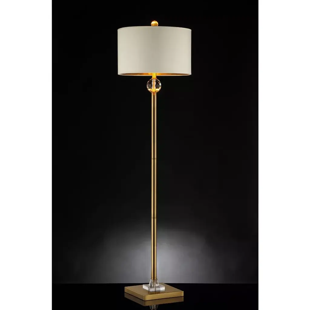 Crisp and majestic, dignifying design of this 63.25" Perspicio solid crystal orb floor lamp is inspired by traditional Corinthian order with a modern twist life-style. Masterfully detailed from the single-leveled matte gold metal base to the graceful Corinthian capital this floor lamp is a showcase of superb craftsmanship. Ornate crystal orb sitting on the gold column style developed in ancient Greece and classified as one of the Classical Orders of Architecture. The Corinthian style is more complex and elaborate. The base of this distinctive modern table lamp is made from a single gold matte body pole atop with a crystal prism orb and a sleek square foot for support. Let this wonderful floor lamp brighten up your living space.