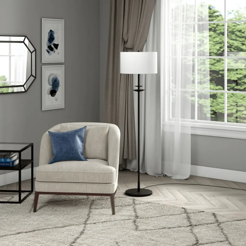 Embrace the good life with this hard working and stylish 63" black traditional shaped floor lamp with white frosted glass drum shade. The base of this lamp is made of metal finished in a black tone. This good looking lamp includes a fabric drum shaped shade. Classically styled, this traditional lamp features a straight pole that extends upwards from a single base. Use this lamp anywhere and elevate the look of the whole space. The perfect lamp to create just the right natural and soothing light in your space. 63" H x 16" W x 16" D