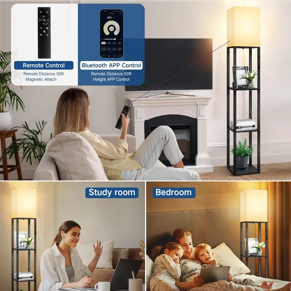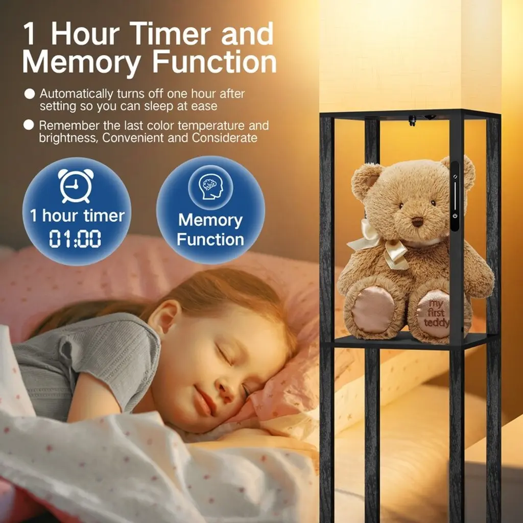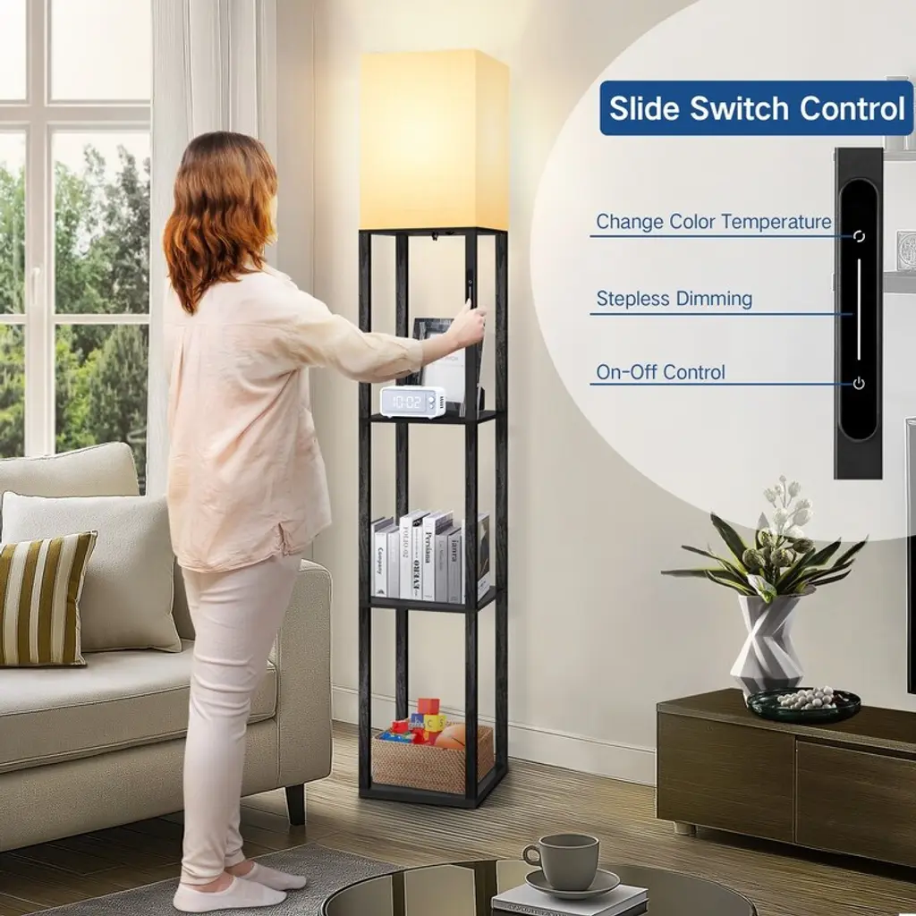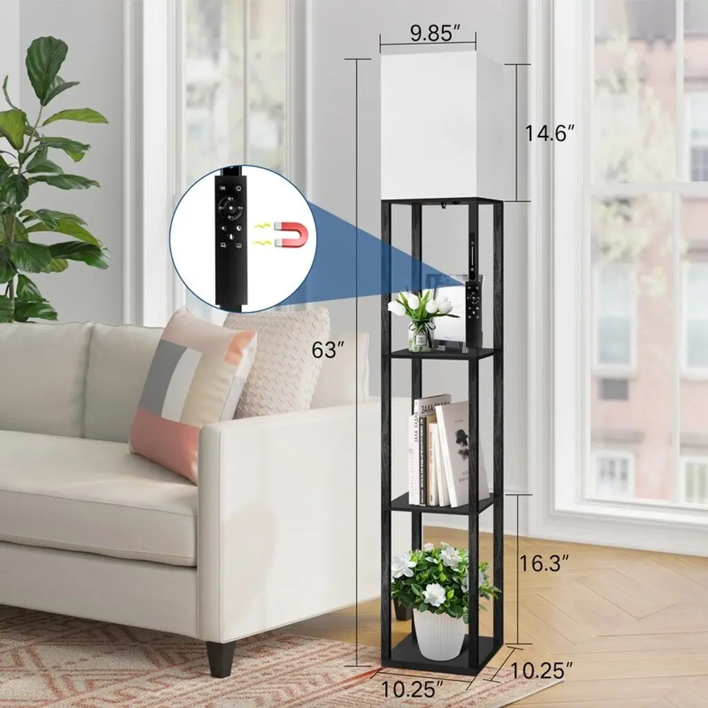 Want to add a little light to your life with this versatile floor lamp? It is made of solid wood material and coated in a clean, classic finish. Consisting of three open shelves, it features the perfect platform for displaying framed photos, figurines, or your favorite books. Simple rectangular shapes with distinctive white linen shades give off a soft, inviting glow. The top shade is open and includes an LED bulb that diffuses its ambient light throughout your space. A slide switch is conveniently located on the stem of this light. It controls 4 color temperatures to provide you with the most comfortable lighting ambiance, and this pillar LED floor lamp will quickly become your favorite cozy spot! Feature: