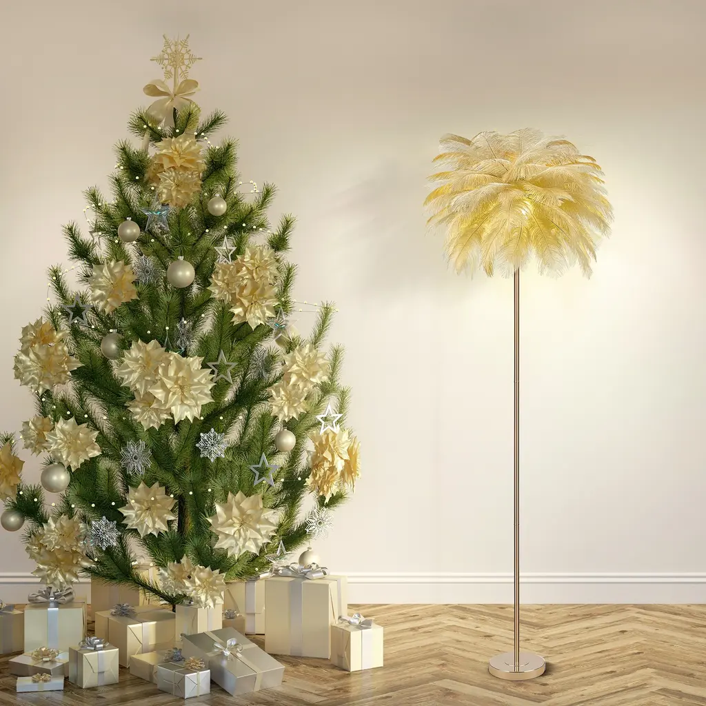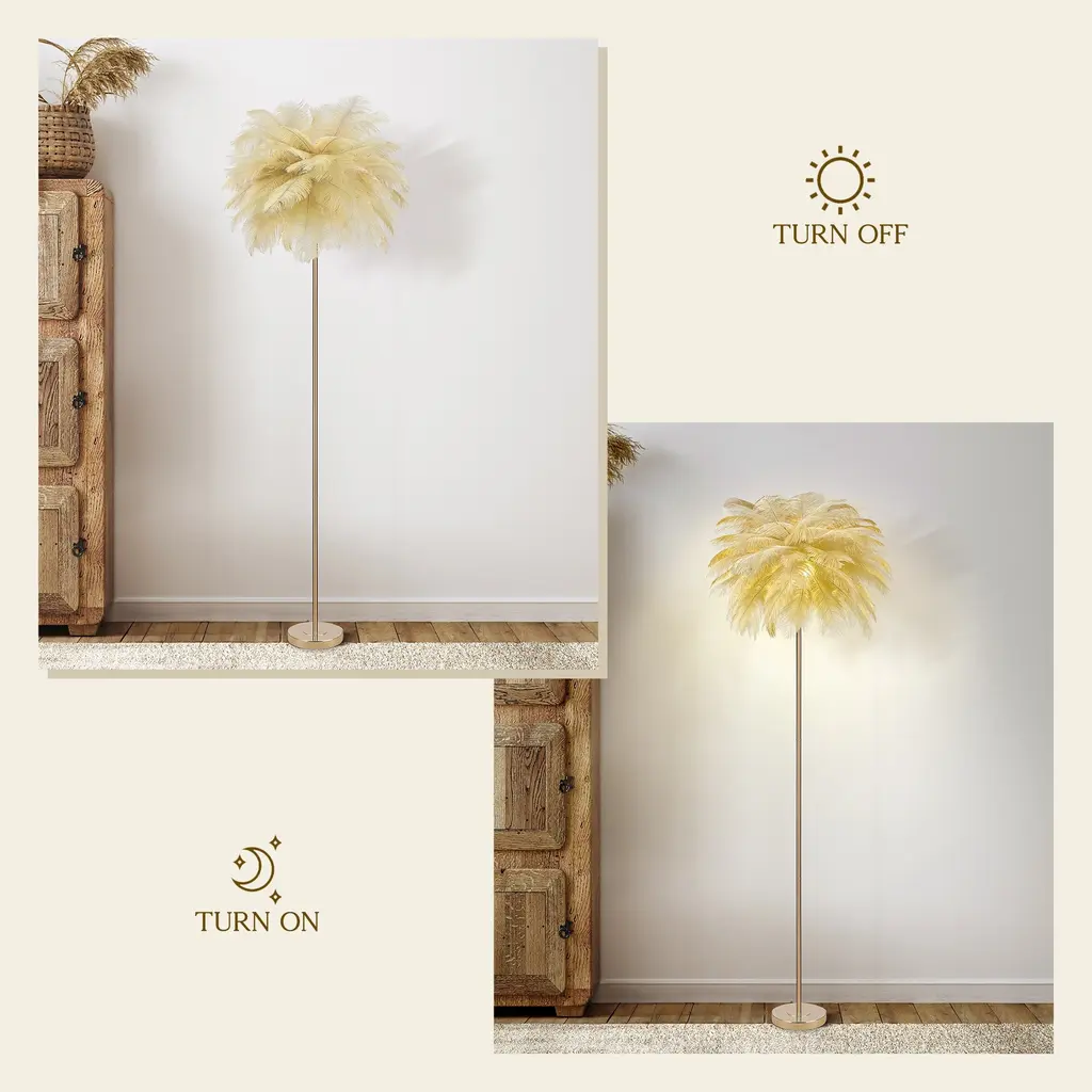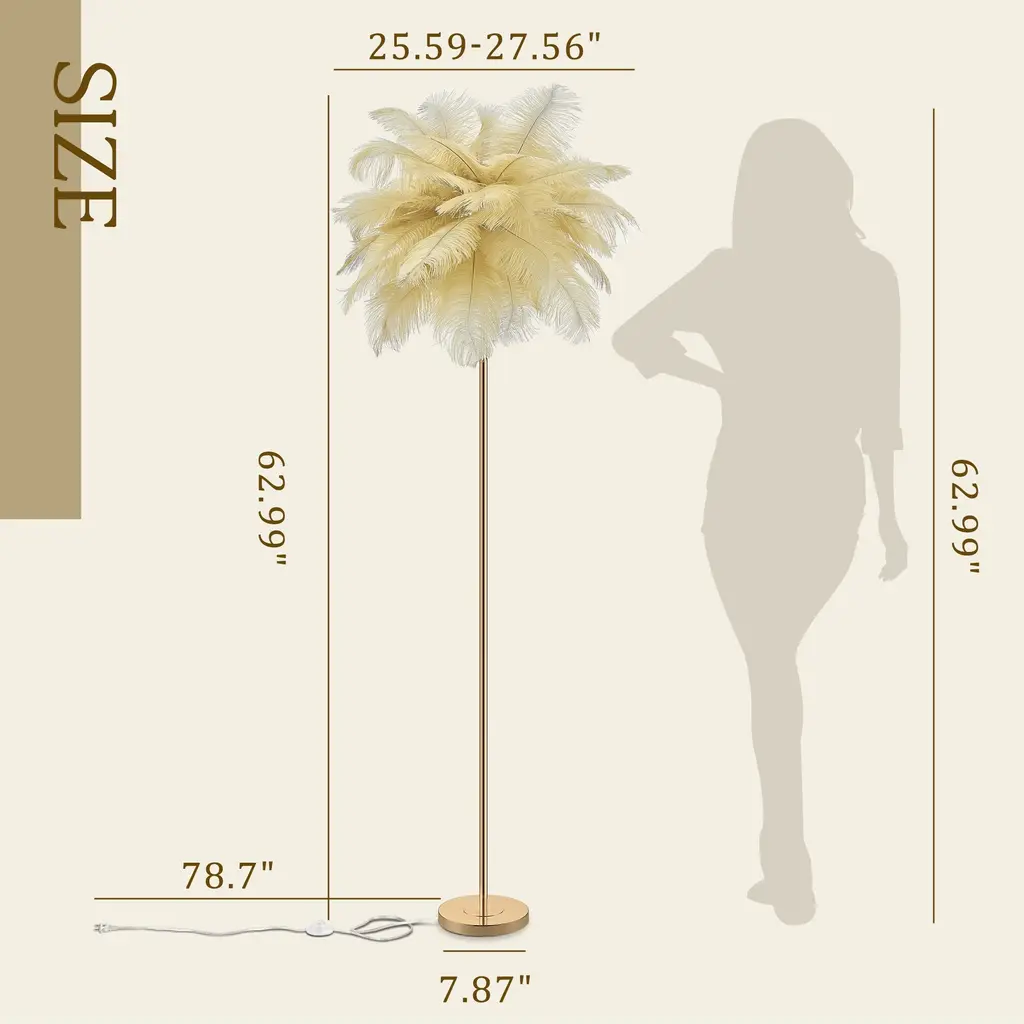 Experience the beauty of nature with our Gold Base & White, Pink or Green Feather Tripod Floor Lamp. The soft ostrich feathers and elegant gold finish base provide a cozy and pleasant glow that will give your space a touch of warmth and romance. Handcrafted with care, this lamp is unique and intriguing, perfect for any rooms in your home. The in-line switch allows for easy control and routine cleaning is a breeze with a hairdryer. 12.60" D x 63" H, an ideal size for your bedside or living room.Features:Note : If your bulbs did not work, please contact us for free replacement.