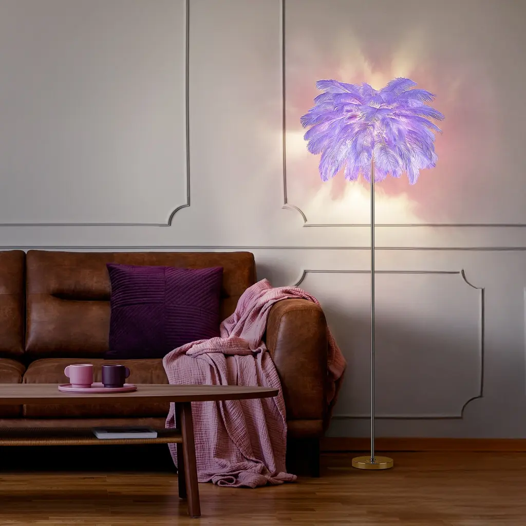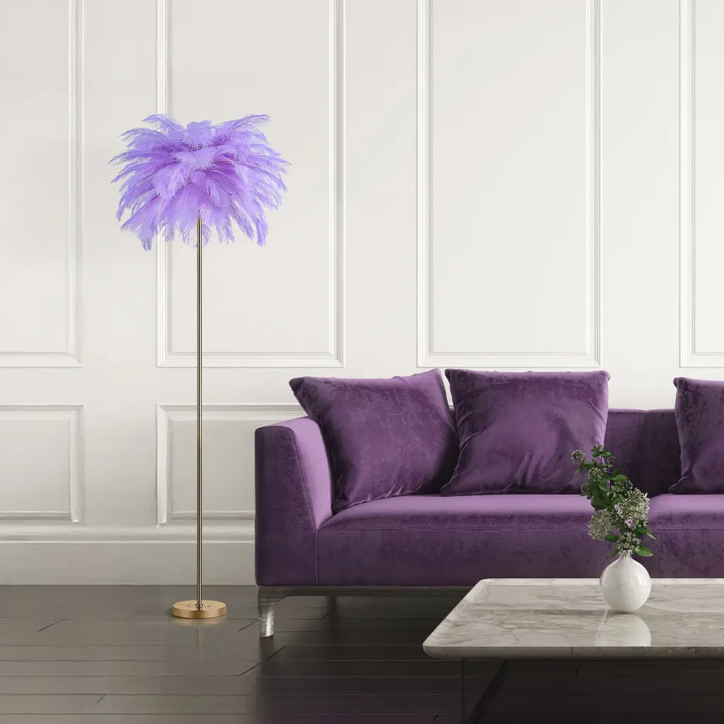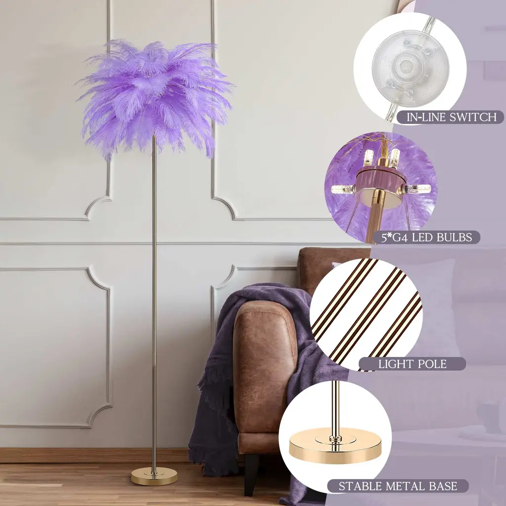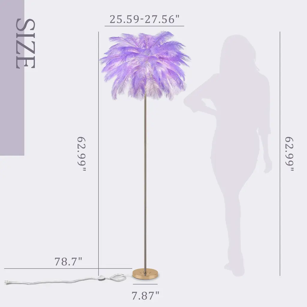 Experience the beauty of nature with our Gold Base & White, Pink or Green Feather Tripod Floor Lamp. The soft ostrich feathers and elegant gold finish base provide a cozy and pleasant glow that will give your space a touch of warmth and romance. Handcrafted with care, this lamp is unique and intriguing, perfect for any rooms in your home. The in-line switch allows for easy control and routine cleaning is a breeze with a hairdryer. 12.60" D x 63" H, an ideal size for your bedside or living room.Features:Note : If your bulbs did not work, please contact us for free replacement.