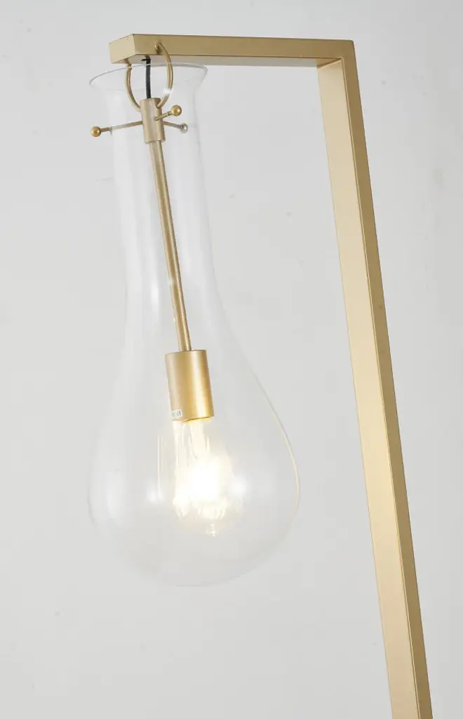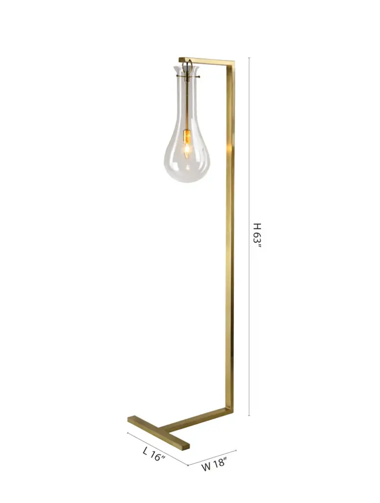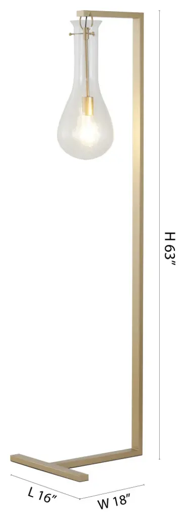 This floor lamp is a special piece of decor to make your room warm and welcoming. The base of this floor lamp is made out of iron in a brass finish, and it comes with a clear glass shade. The height is in 63 inch. It is perfect to be used in living room, bedroom, reading room, and office.Dimension: L16"W18"H63"Number Of Bulb: 1Bulb Type: E26Wattage: 60WBulb Included: NoCUL/UL/CSA Listed