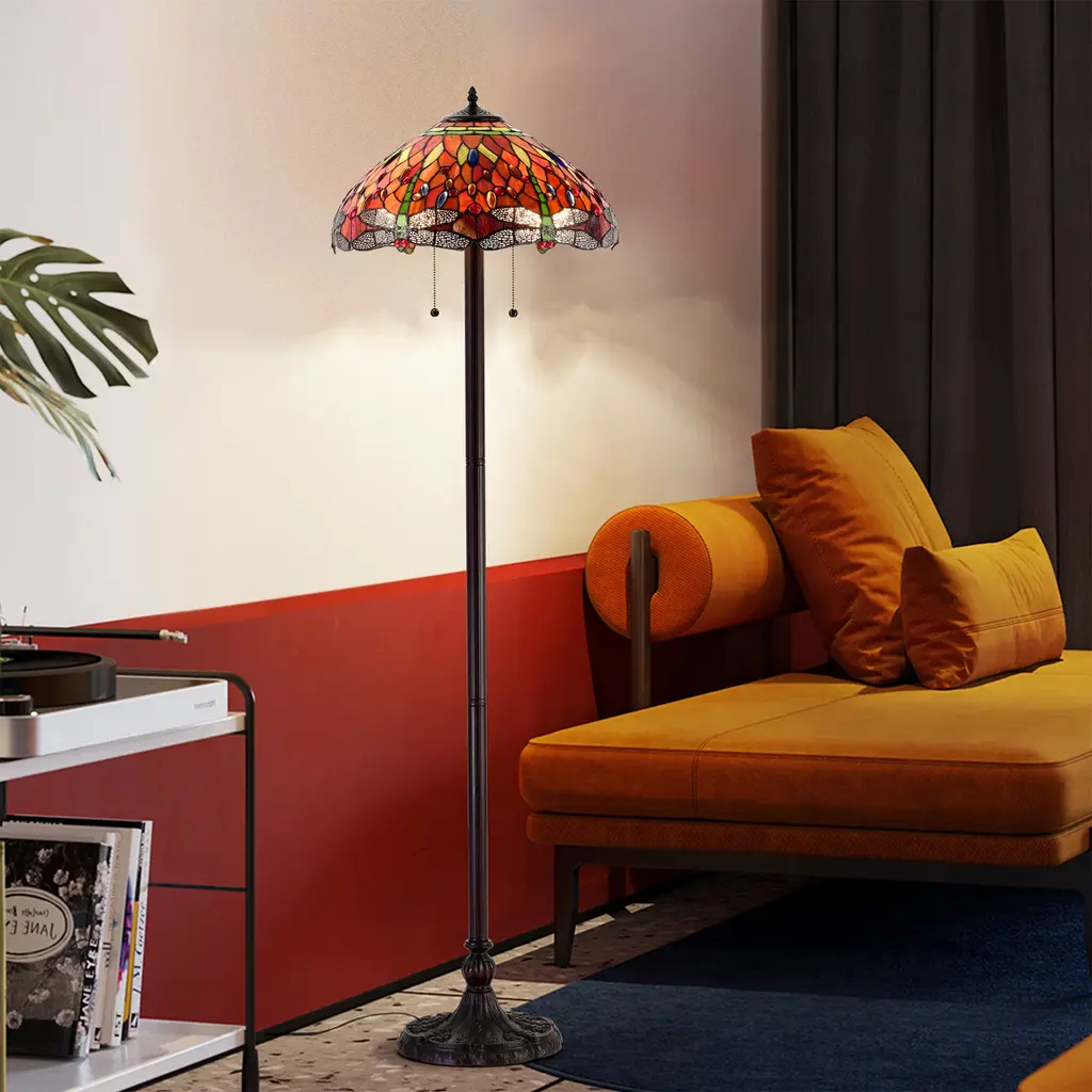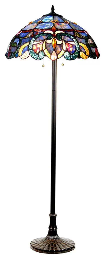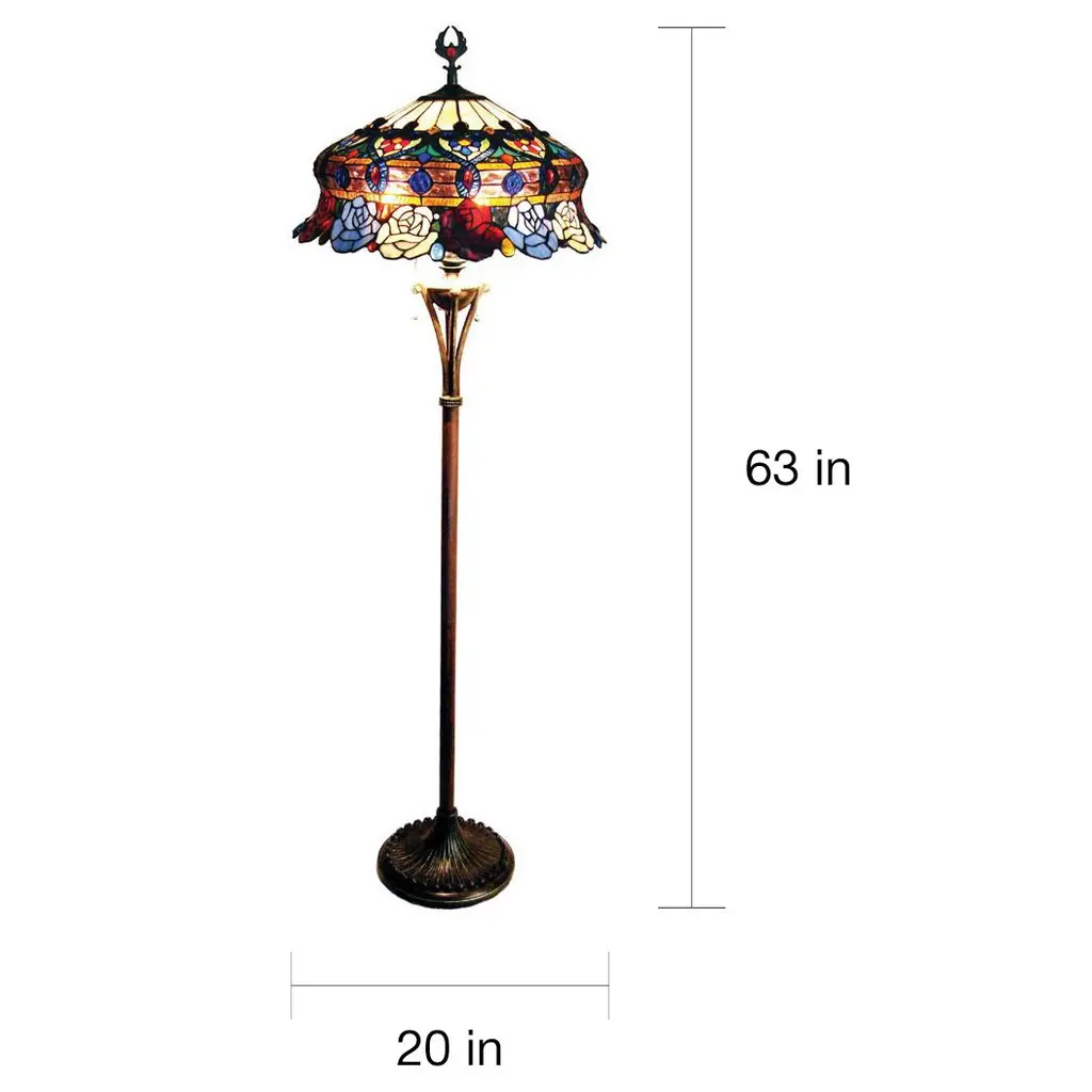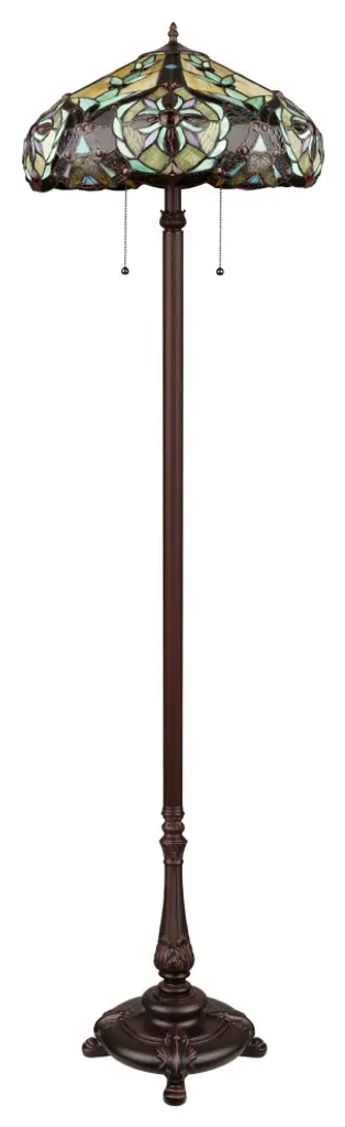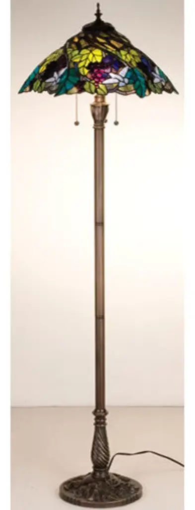 A bluebird in flight hovers above spiraling Concord Purple jewels, Vineyard Green leaves and glistening dew kissed Bark Brown vines in this beautiful shade. A Mahogany Bronze finished floor lamp base with grape and vine detail set off the beautiful shade. UL Approved: YesHardwire or Plug: PlugBulb Quantity: 3Bulb Type: MEDBulb Wattage: 60Bulbs Included: No