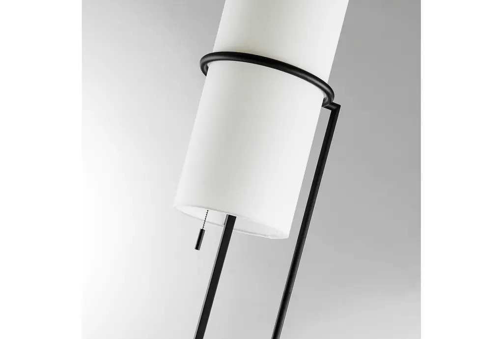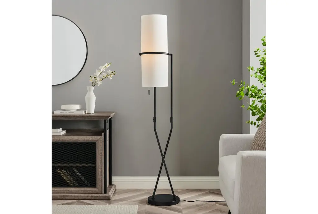 Modern design with a sleek black metal X base. Features a neutral ivory cylindrical shade for a contemporary look. Standing floor lamp with a convenient pull string for easy operation.