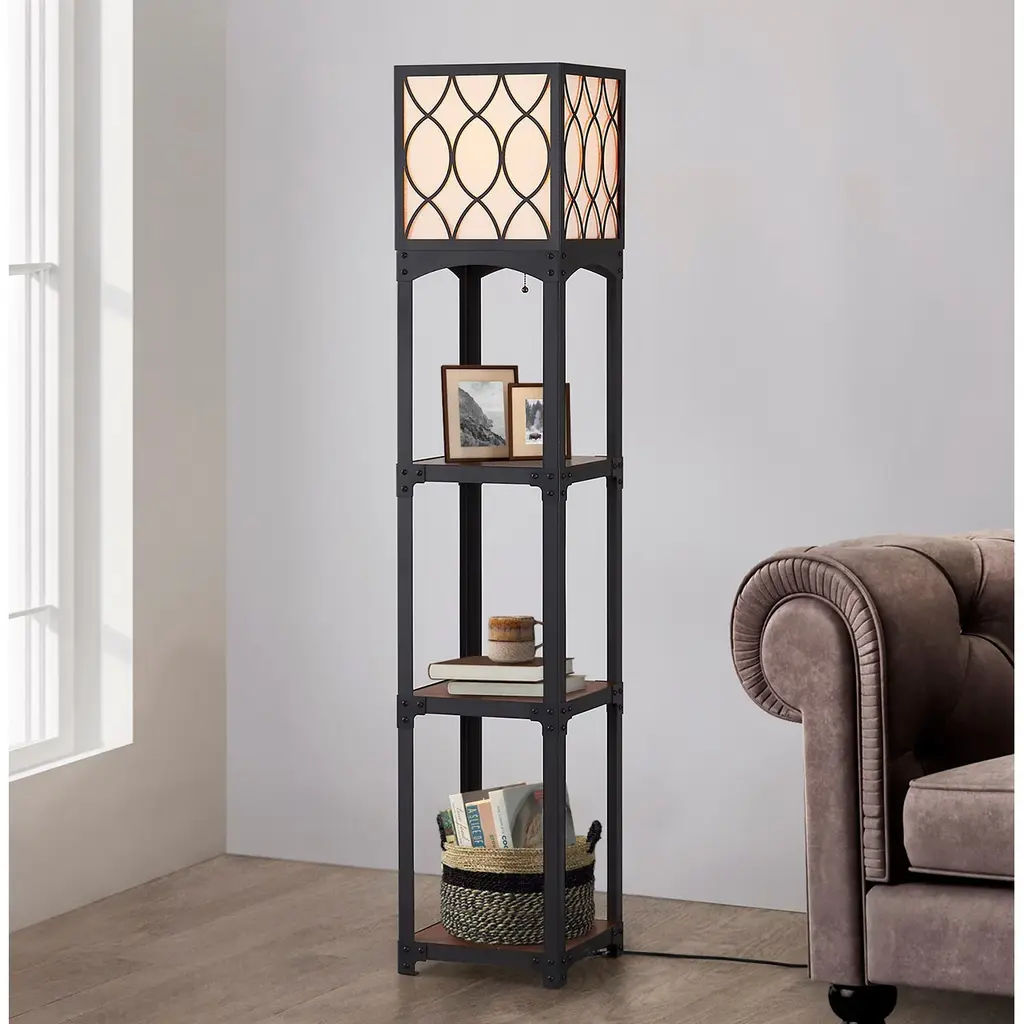 64"h Vintage Iron With Wood Shelves And Laser Cut Metal Shade Floor Lamp - Curved-Pattern Shade