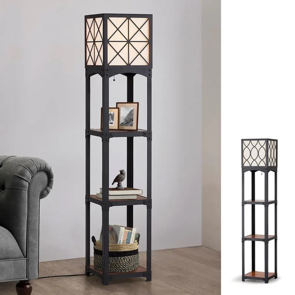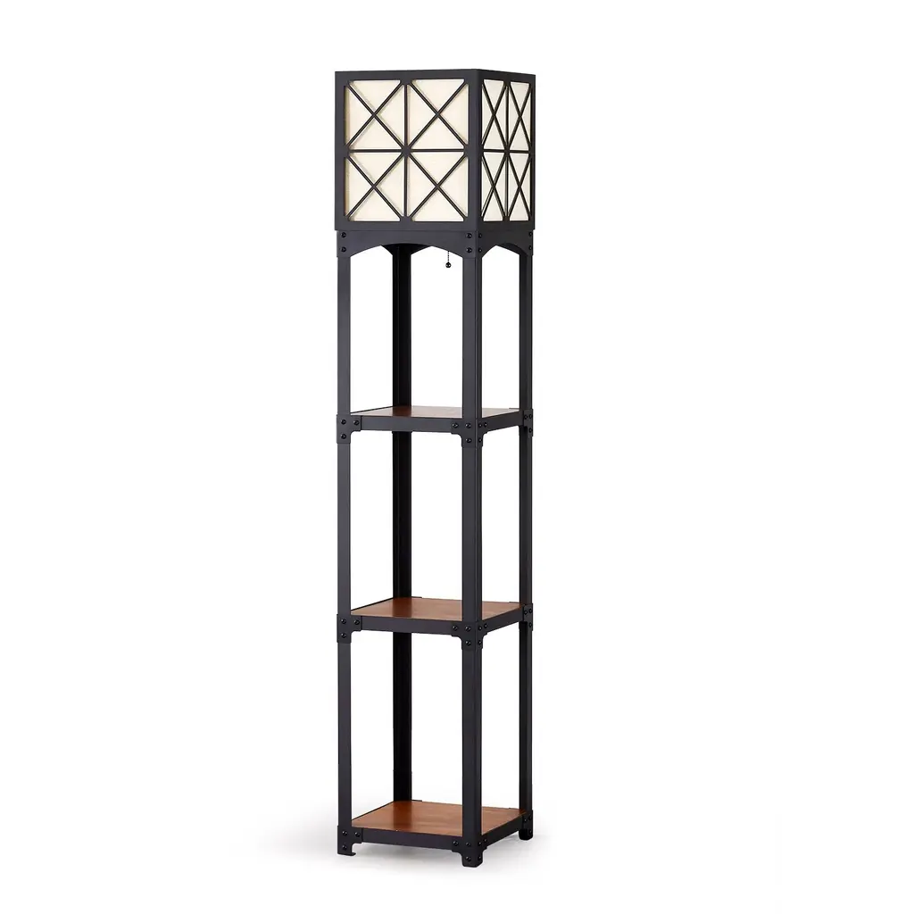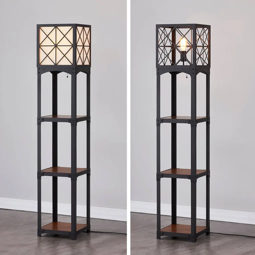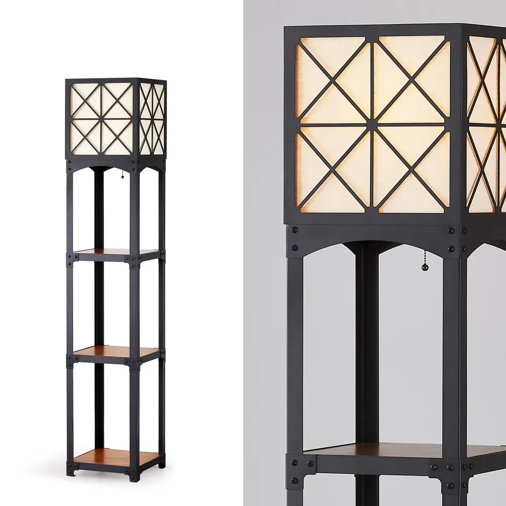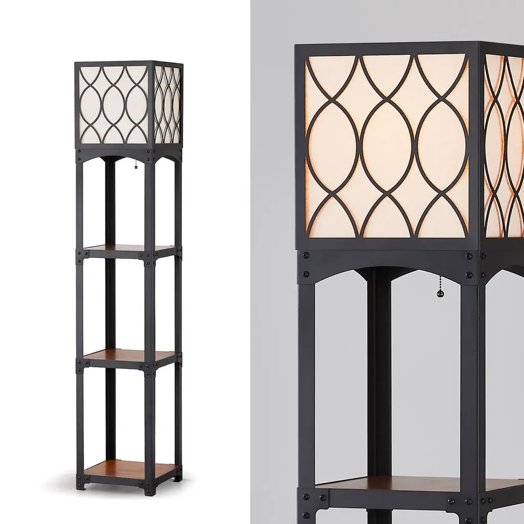 The Vintage Iron floor lamp features 3 wood shelves with industrial style iron frame, wire mesh Lamp shade with inner detachable linen shade gives option to use expose vintage Edison light bulb, a HOMEGLAM creative lighting design solution for your living style. • 64"H, 12.5" Square iron frame floor lamp • 3 hardwood shelves, Vintage Black finish iron frame • Metal outer lamp shade with detachable Tan color linen inner lamp shade ( Detachable inner linen shade for vintage bulb may used, *Bulbs not included") • Classic pull chain on/off switch • uses one A19 100W max. incandescent or equivalent LED, CFL bulb, *Bulbs not included • ETL Listed, assemble required