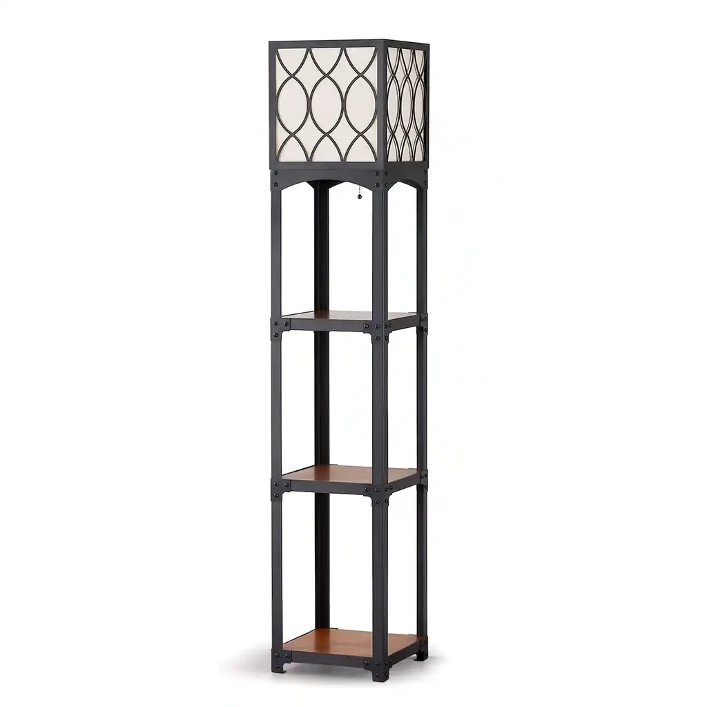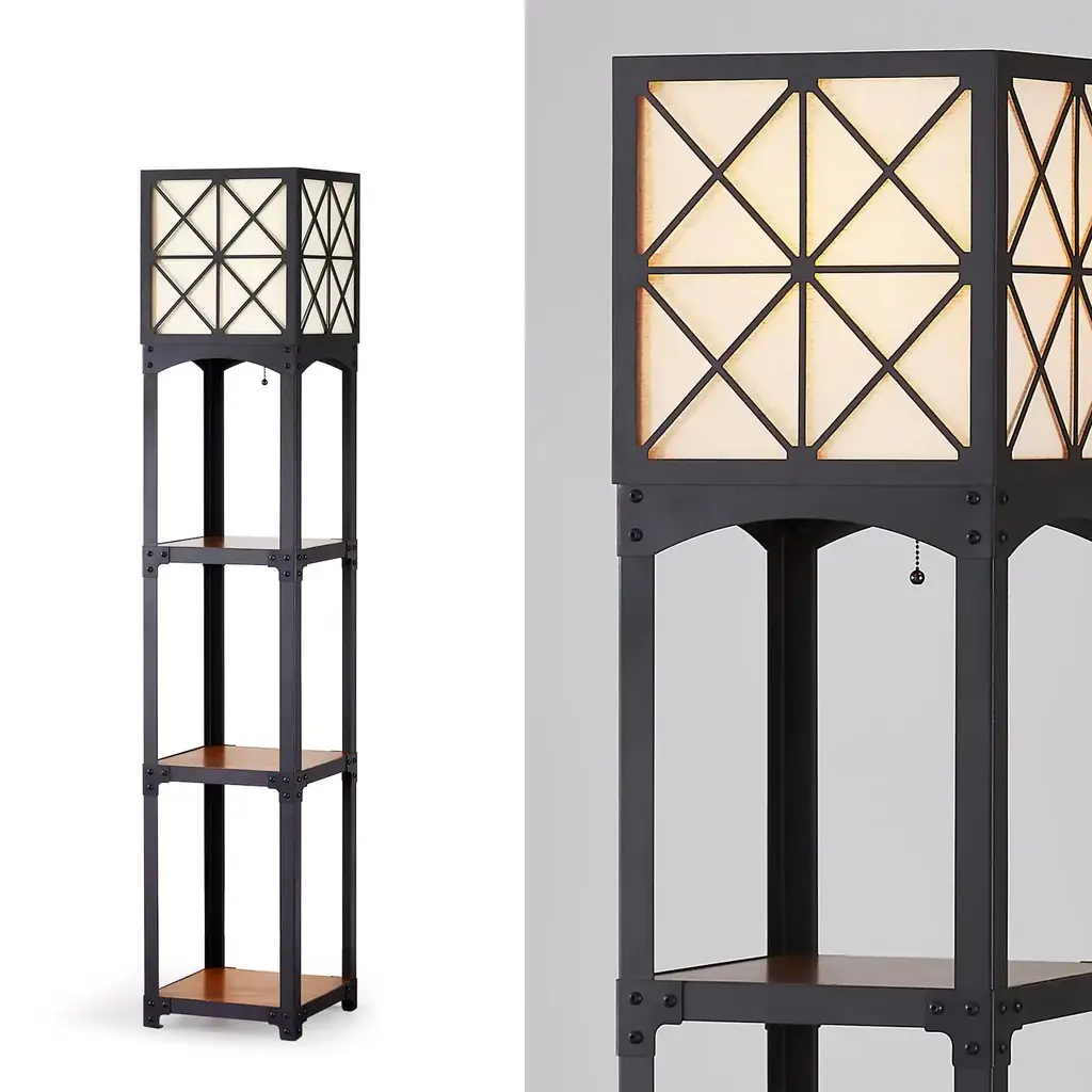 64"h Vintage Iron With Wood Shelves And Laser Cut Metal Shade Floor Lamp - X-Pattern Shade