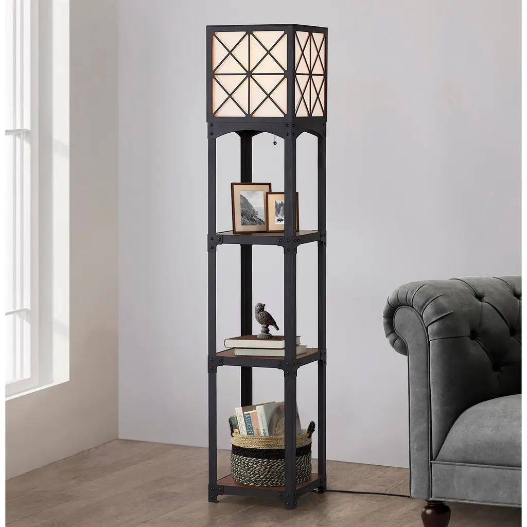 The Vintage Iron floor lamp features 3 wood shelves with industrial style iron frame, wire mesh Lamp shade with inner detachable linen shade gives option to use expose vintage Edison light bulb, a HOMEGLAM creative lighting design solution for your living style. • 64"H, 12.5" Square iron frame floor lamp • 3 hardwood shelves, Vintage Black finish iron frame • Metal outer lamp shade with detachable Tan color linen inner lamp shade ( Detachable inner linen shade for vintage bulb may used, *Bulbs not included") • Classic pull chain on/off switch • uses one A19 100W max. incandescent or equivalent LED, CFL bulb, *Bulbs not included • ETL Listed, assemble required