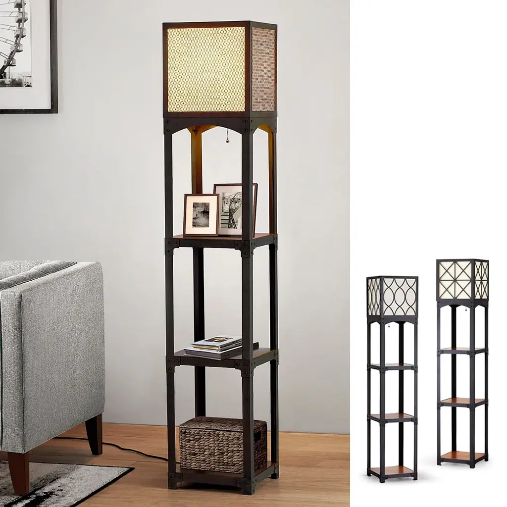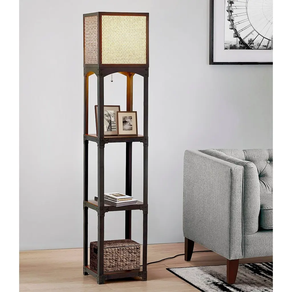The Vintage Iron floor lamp features 3 wood shelves with industrial style iron frame, wire mesh Lamp shade with inner detachable linen shade gives option to use expose vintage Edison light bulb, a HOMEGLAM creative lighting design solution for your living style. • 64"H, 12.5" Square iron frame floor lamp • 3 hardwood shelves, Vintage Black finish iron frame • Metal outer lamp shade with detachable Tan color linen inner lamp shade ( Detachable inner linen shade for vintage bulb may used, *Bulbs not included") • Classic pull chain on/off switch • uses one A19 100W max. incandescent or equivalent LED, CFL bulb, *Bulbs not included • ETL Listed, assemble required