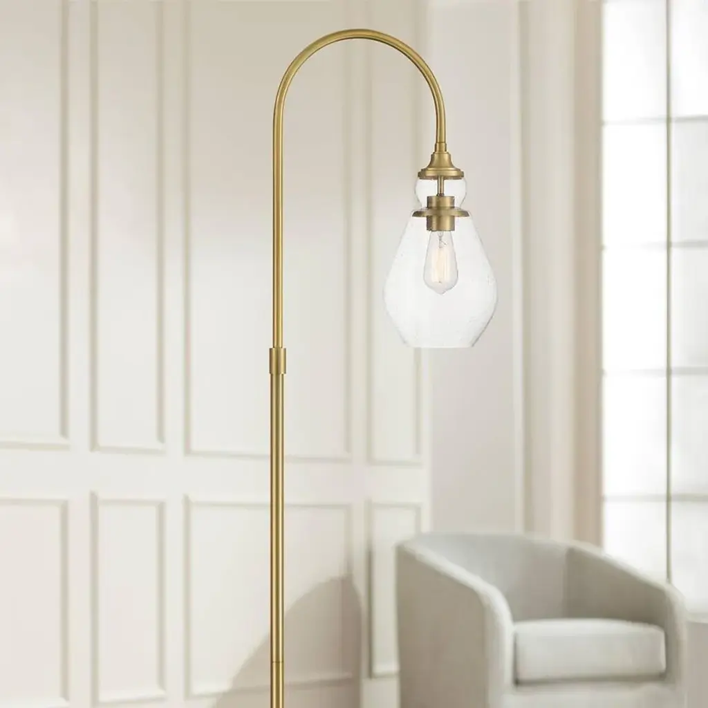 PRODUCT DETAILS: 66" high overall. Base is 11" wide. Glass shade is 12" high x 8" wide x 5" bottom opening. Outer edge of base to outer edge of light is 17". Weighs 16 1/2 lbs. Uses one maximum 100 watt standard-medium base light bulb (not included). Shown with a clear glass Edison filament bulb. On-off step switch on the cord for easy lighting control. Arc arm design with offset light. Makes an ideal reading lamp or chairside lamp. From the Possini Euro Design brand. Warm gold finish base and pole. Metal construction. Clear seeded glass allows the bulb to be seen. 8-foot long clear-silver cord. DESCRIPTION: From the Possini Euro Design collection, the Vaile floor lamp offers streamlined and luxury style for your home. Inspired by Deco and modern designs, the classic profile features an arc profile with a seeded glass shade. The metal base, pole, and arm all come in a warm gold finish. A convenient step foot-switch controls the on-off function and gives you easy lighting control.