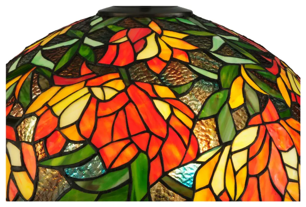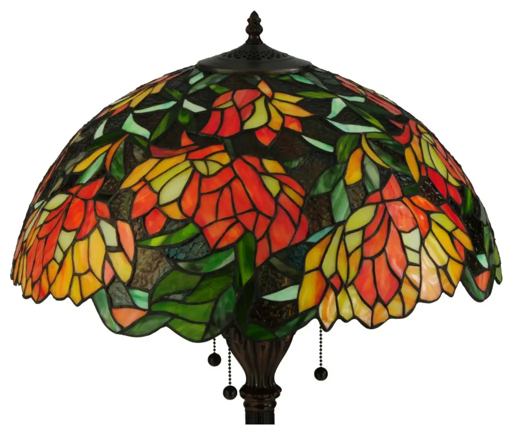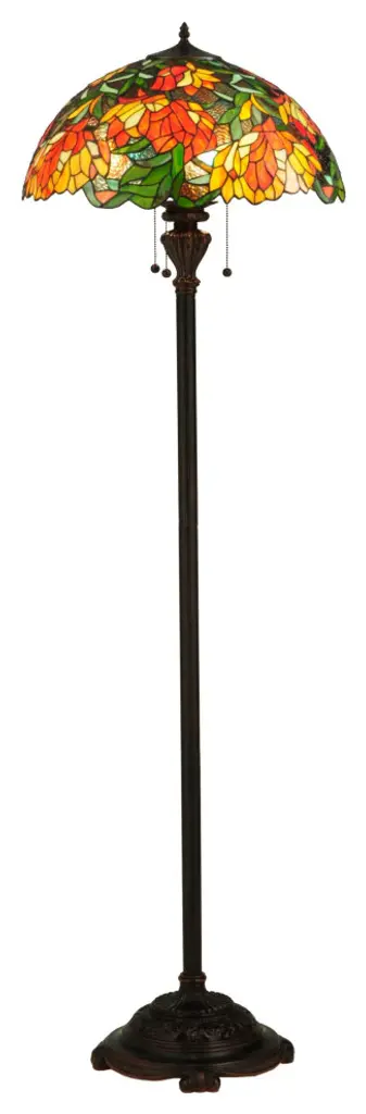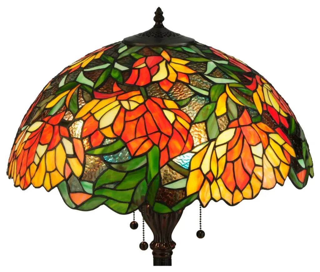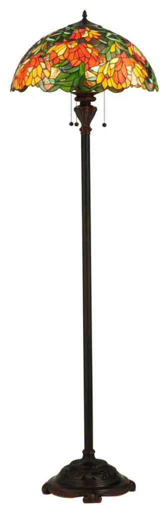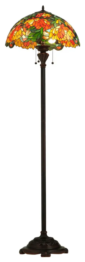 In all its natural beauty, a bouquet of blossoming flowers in Peach, Tangerine and Yellow hues bloom while surrounded by radiant Willow Green leaves and glistening Multicolored Rippled glass. This lamp is so beautiful that you will think you are sitting in an English Garden. This stunning Tiffany styled stained glass shade, with a coordinating floor base in a warm Mahogany Bronze finish, will add a brilliant, luxurious elegance to your home. UL Approved: YesBulb Type: MEDBulb Quantity: 3Bulb Wattage: 60Bulbs Included: No