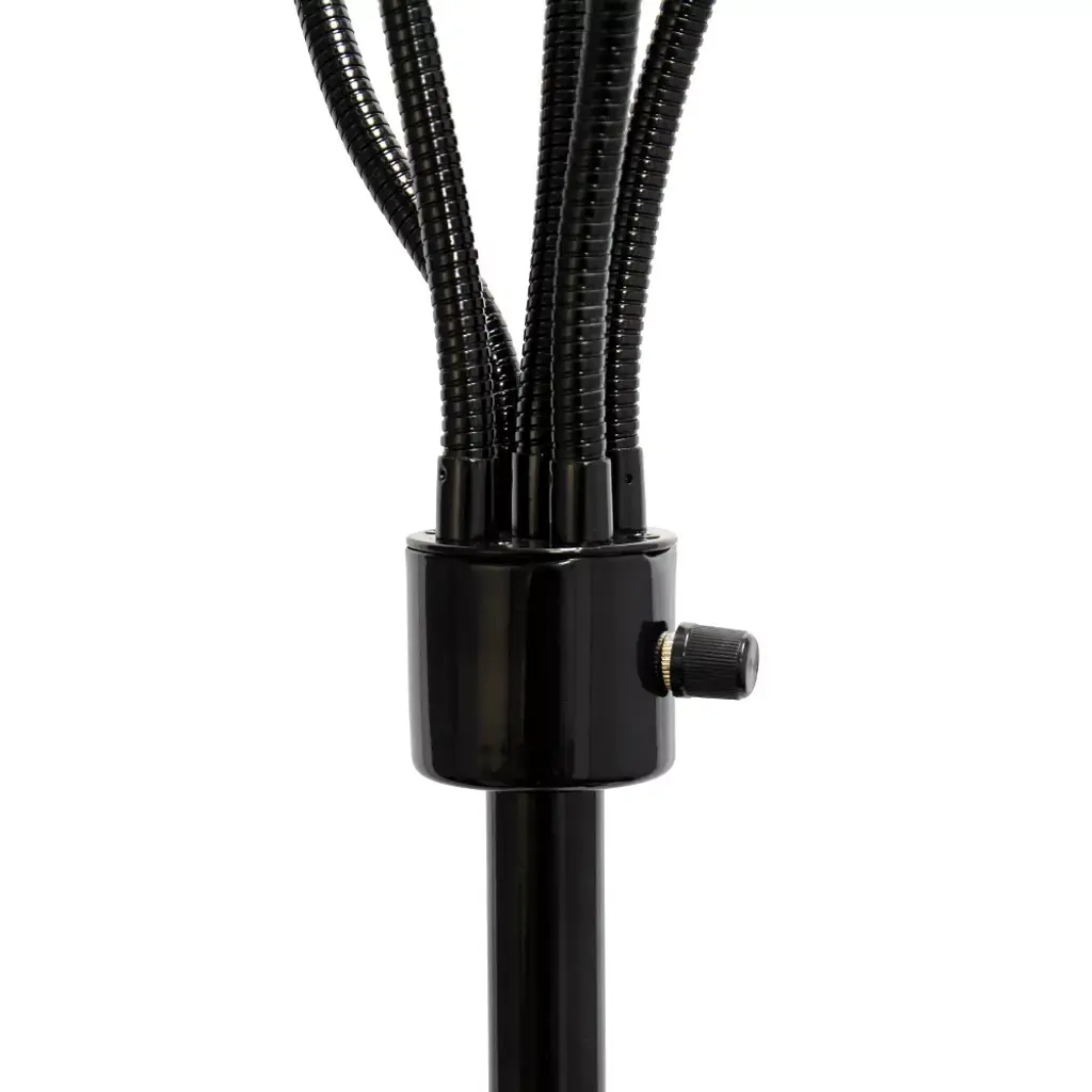 What a fun and trendy floor lamp this is! With a tall sturdy base below 5 flexible goosenecks extending to a plastic sloping shade, this 67" metal lamp is ideal for environments requiring different directions of light as needed. The extensions are easy to maneuver to provide light up, down, sideways, etc. without having to move your lamp from its location. Check out all of the available base finish/shade color options available to suit your needs.