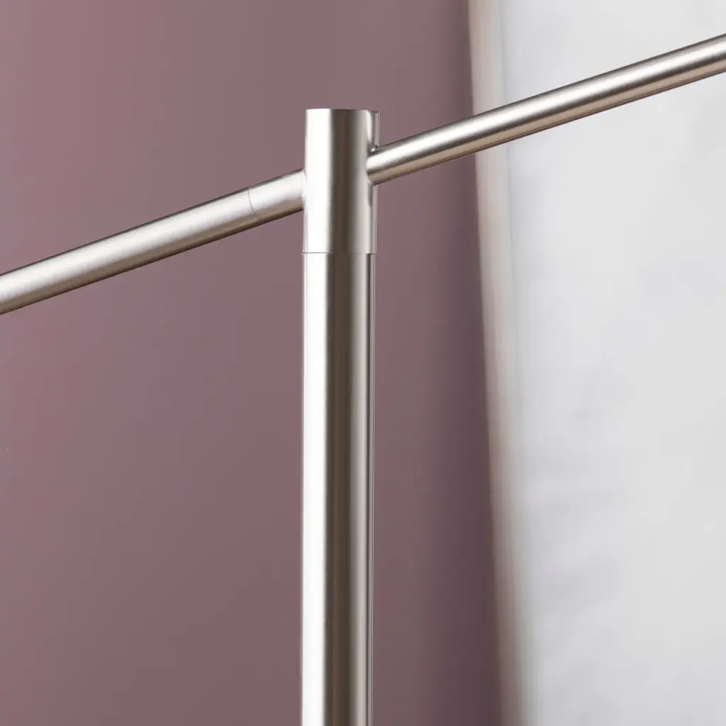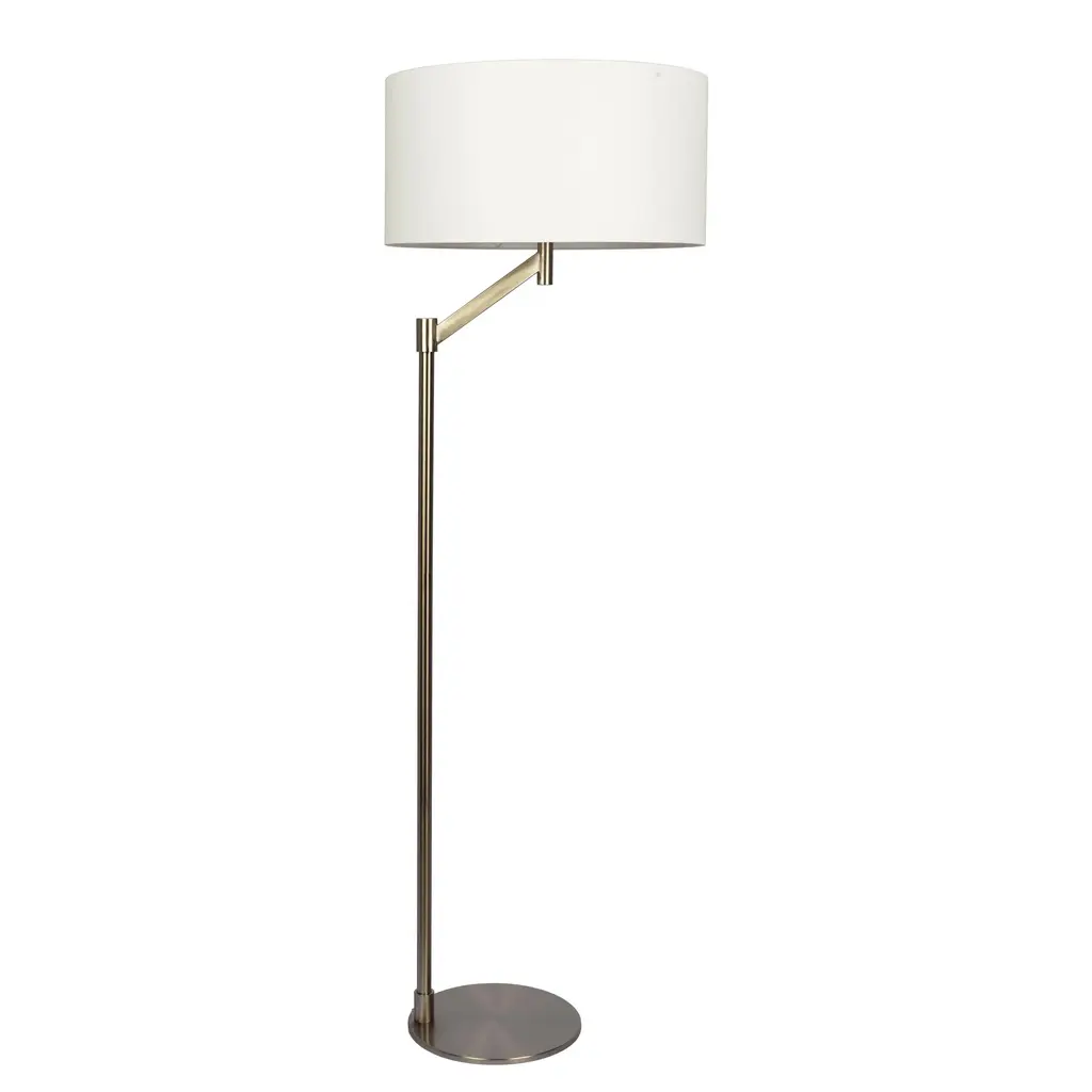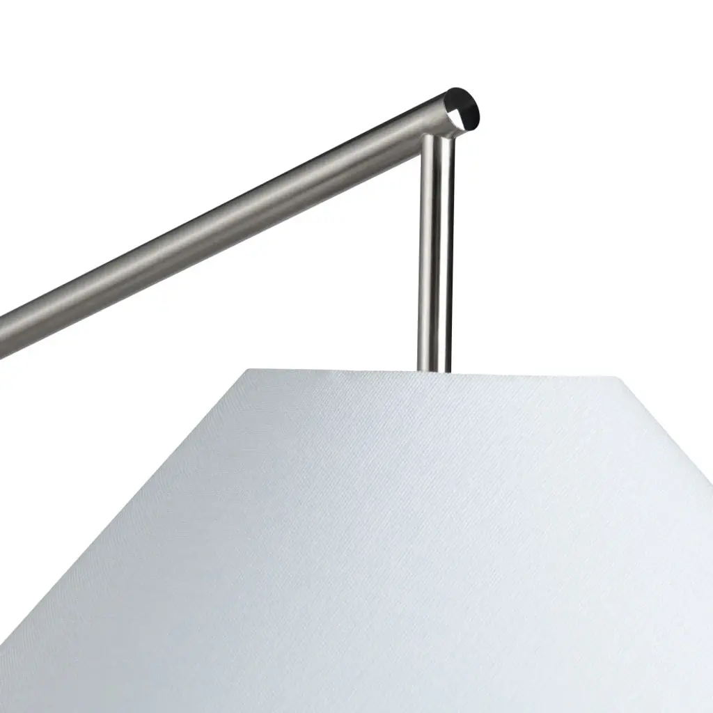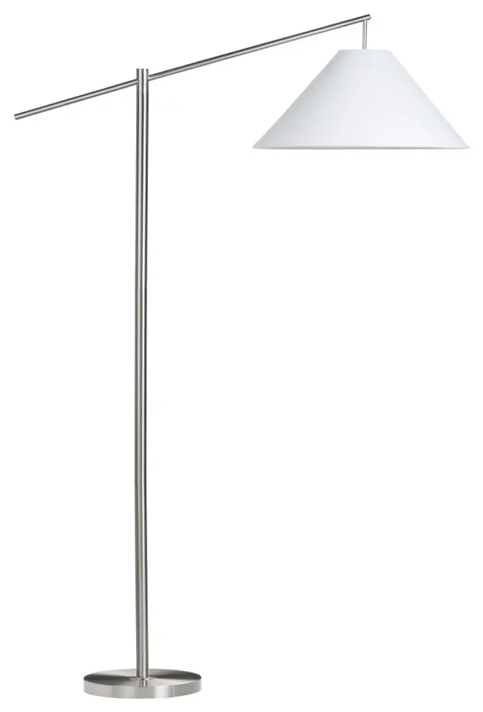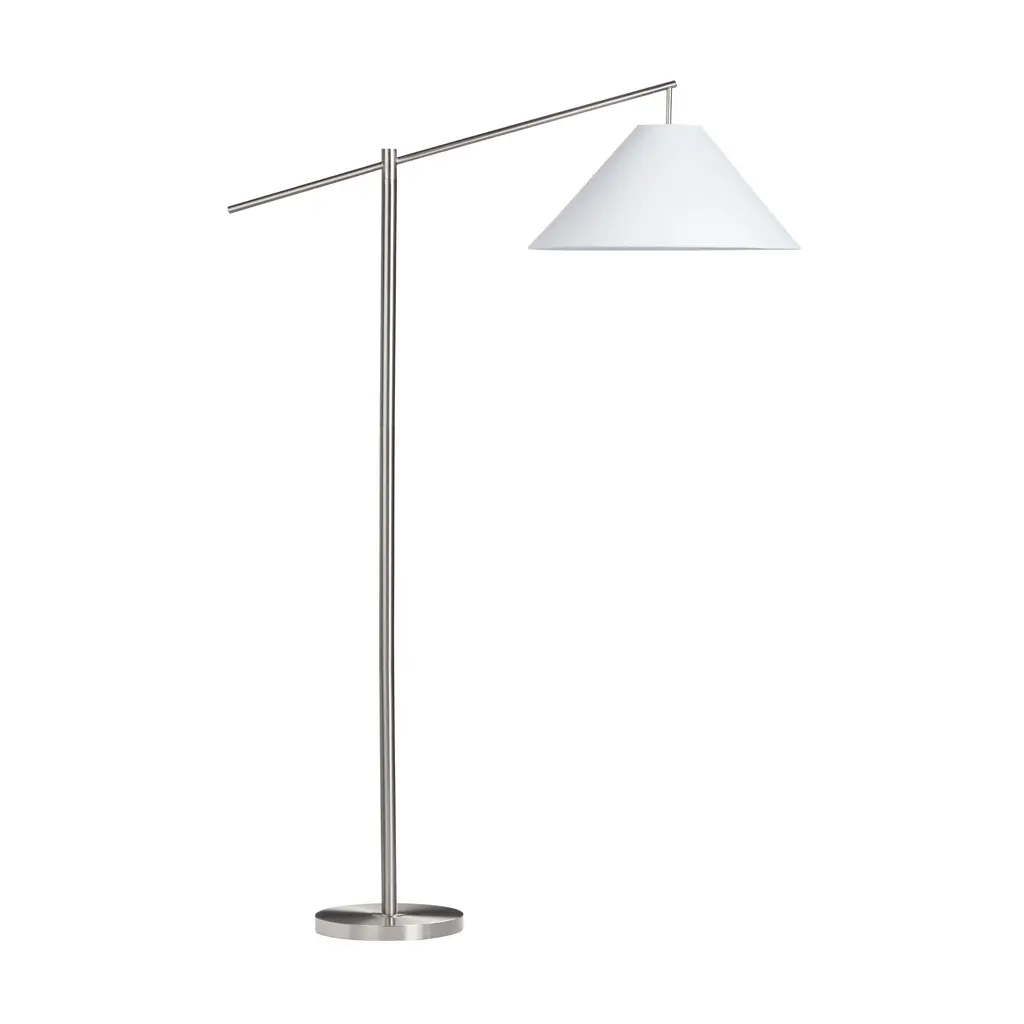 This sleek floor lamp seamlessly blends modern style with functionality. Crafted from durable steel with a brushed silver finish, its minimalist design features a sturdy round base and an extended horizontal arm for an architectural touch. The crisp white tapered drum shade, made from linen with a hardback construction and secured by a threaded uno fitter, softly diffuses light, adding elegance to any room. Conveniently equipped with an in-line on/off switch on the 6-foot clear cord, this lamp accommodates a 100W bulb (not included), making it perfect for task or ambient lighting. Its clean lines and timeless design enhance any space with contemporary sophistication