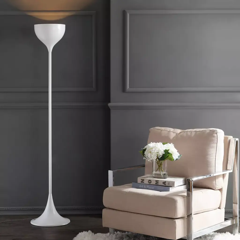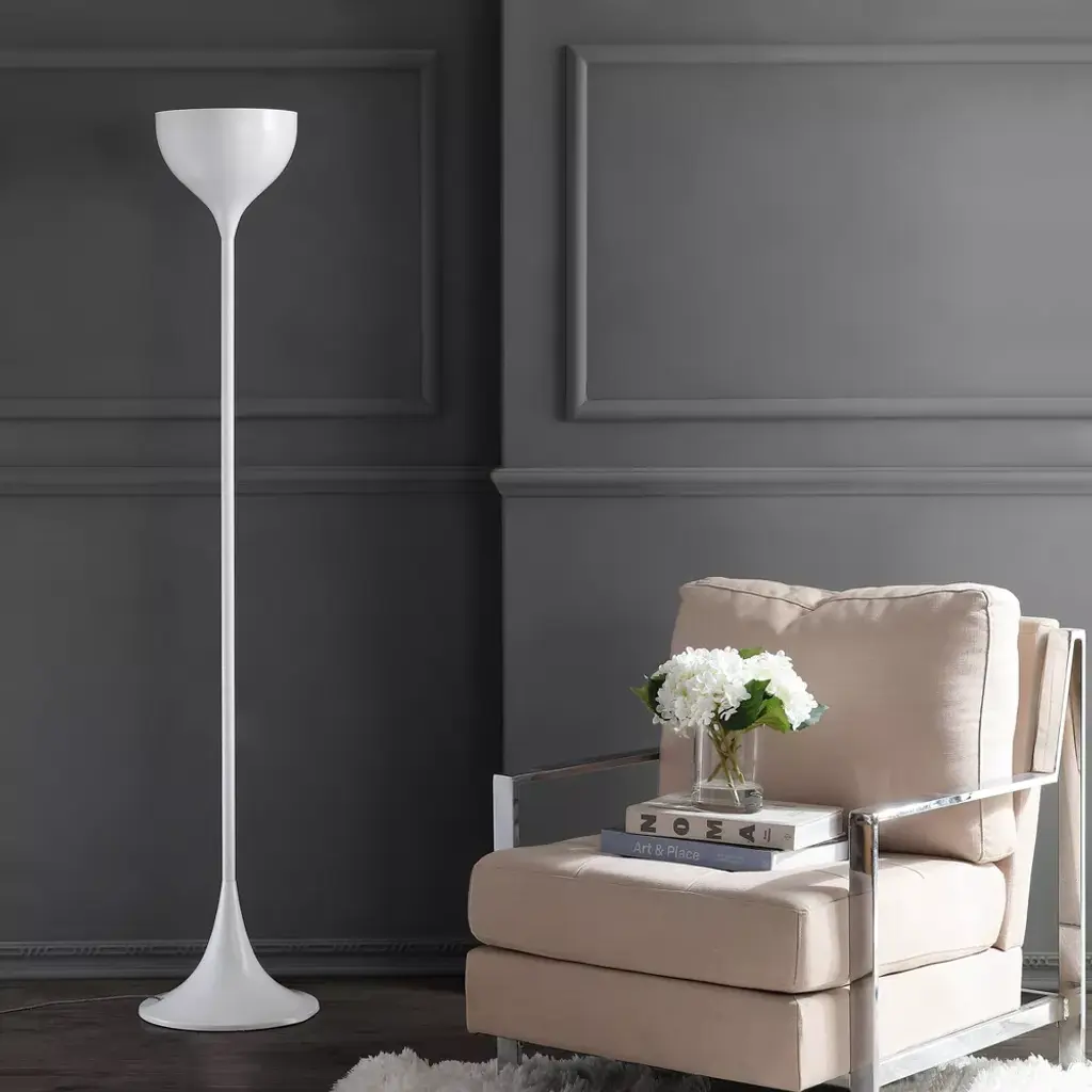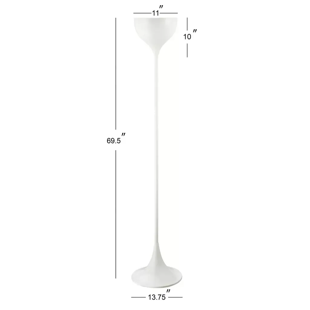 This unique silhouette and bright white finish instantly attract the eye and brighten any room. Stands tall at 69.5" and features a convenient foot-step switch. A beautiful silk wrapped cord finishes the piece. Finished in white, the metal body and shade will suit any color palette. Beautiful to display or easy to conceal: the 72" cord is silk-wrapped. On-off foot-step switch. Eco-friendly 9W LED bulb included. Takes one bulb and compatible with any 12W LED or 100W TYPE "A" or 23W CFL. UL Listed. Before cleaning any lamp shade or fixture, disconnect the power source. Wipe with a soft, dry cloth. Avoid the use of chemicals and household cleaners as they may damage the finish.