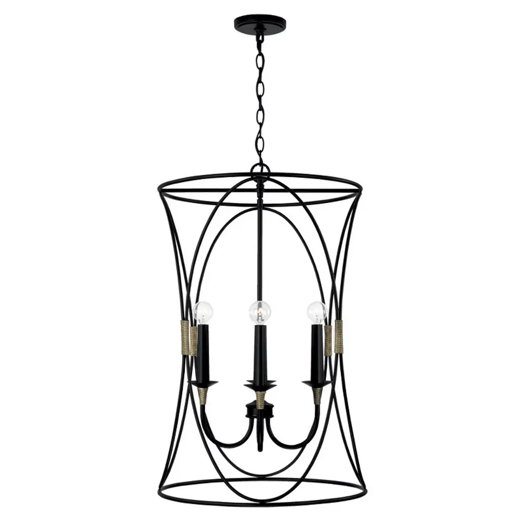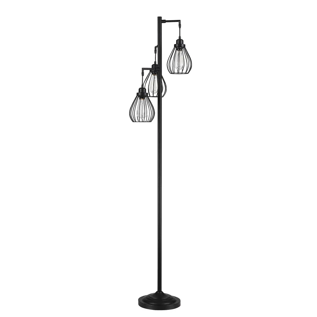 69 In. 3-Light Tree Floor Lamp With Matte Black Finish And Hanging Steel Cage Shade - Black