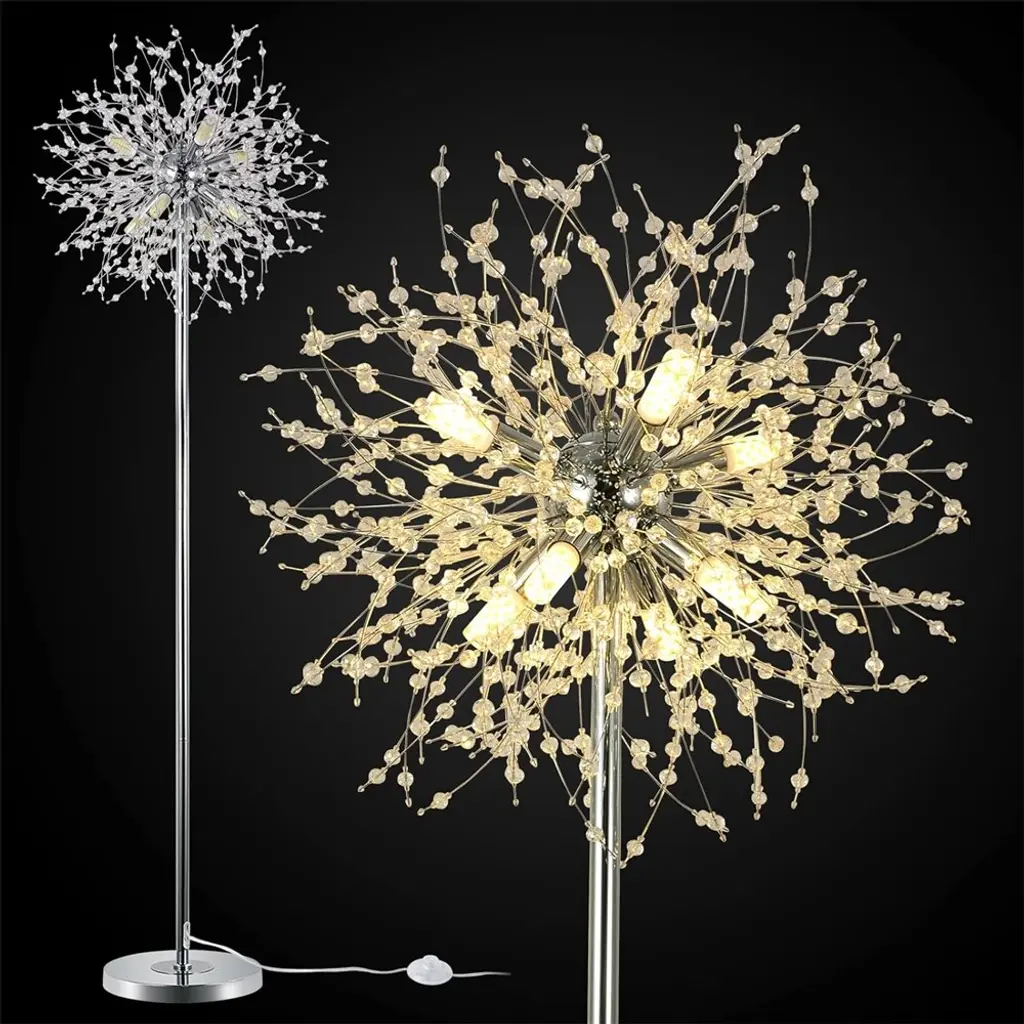 【Modern and Elegant Crystal Floor Lamp 】Gold floor lamp with shiny and clear K9 crystals look so luxury and classy. Each well made crystal has undergone meticulous polish, refracting beautiful glimmer when light shine through, definitely win compliments from your guests. 【Upgraded Tall Pole Lamp】68.9 inch standing lamp comes with a steady metal base, which well guards against tipping accidently and ensures safety of family. The thickend slender poles design make it a practical corner lamp - for accent or reading lighting at your office/desk side. Fits living room, bedroom, study, girl's room. 【Standing Lamps for Living Room Decor】The classy mid century floor lamp features matte gold finish, combines shining K9 crystal bunches, looks great with most home decor. Thoughtful foot switch design also fully considers pregnant women and the elderly, convenient to operate without having to bend down. 【UL Standard & Bulbs require】The firework floor lamp is compatible with 8 * G9 LED or Halogen blubs (10W max, bulbs NOT Included), we suggest LED bulbs for low energy consumption and long-lifespan. Create a different atmosphere by changing the light bulb, one light for multiple purposes! All the socket, switch, wire and base are comply with UL standard!