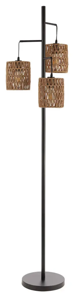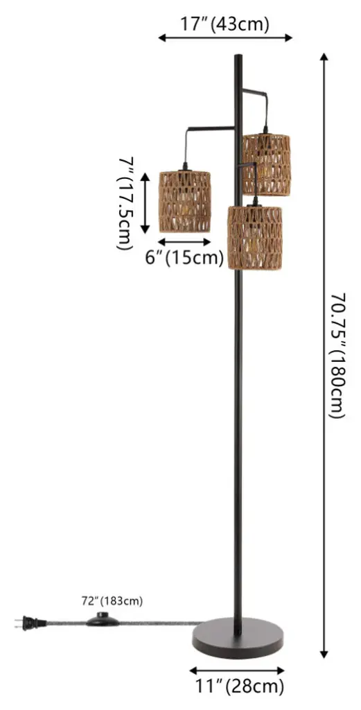Vintage style meets Bohemian chic in our retro 3-light floor lamp. LED bulbs provide warm, bright light for reading. The diamond-patterned paper rope lampshades add a cozy ambiance to the living room or bedroom.-The black metal finish is accented by lampshades in natural woven paper rope-Quality touches include a weighted base and silk-wrapped cord with foot-step switch-This lamp''s tall height brightens any dark corner; paper rope shades add a rustic, coastal touch-Eco-friendly 4W LED bulb included-Takes 3 bulbs and compatible with TYPE "A" 40W or CFL 13W or LED 9W-Color Temperature: 2700K-CRI: 80-Color: Black with Brown Shades-Body Material: Metal-Base Material: Metal----Includes: One (1) lamp-Assembly Required-Lamp: 70.75 inches high x 17 inches wide x 17 inches deep-Shade: 7 inches high x 6 inches wide x 6 inches deepYou see a lamp.We see a decorative work of art.A perfectly curved shade casts a dramatic shadow on a floor. A silk cord you never want to hide. Compatible with LED lightbulbs: as easy on the environment as they are on the eyes. The JONATHAN Y Lighting collection considers every detail from impeccably sourced materials to designer styling. And our prices are so attractive, we''ve transformed a functional necessity into a fashion accessory.JONATHAN Y Lighting - a fashion revolution in home decor.