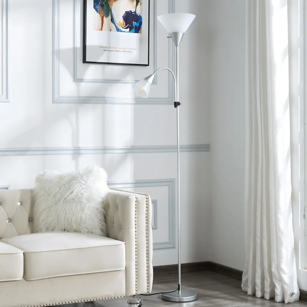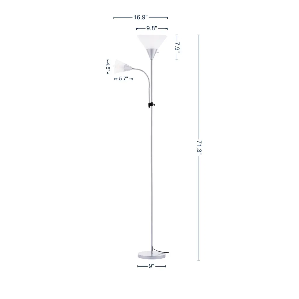 Elevate your home lighting with this sleek and modern 71.3-inch tall standing LED floor lamp, designed to blend style and functionality effortlessly. Perfect for living rooms, bedrooms, offices, or reading nooks, this lamp features a shade that diffuses light evenly, creating a warm and inviting ambiance.Customize your lighting experience with adjustable brightness levels, allowing you to set the perfect mood—whether you need bright task lighting for reading or a soft glow for relaxation. Features: - With the space-saving design, can fit easily in any corner of the room. - Bulb is not included. This lamp set is bulit with E26 sockets (maximum 60-watt) which are compatible with E26 Edison, LED and halogen bulbs. - Main lamp on top and a side reading light design, with rosted arcylic cone lampshades. - Durability & Stability, made of metal post & base, and the thickened base makes it more stable and prevents from shaking or tipping; - Foot switch, easy to turn on/off the lights when your hands are occupied. - 4 Color for choosing. Specifications: Overall size:16.9"x11.8"x71.3"H Base size:9" Shade:16.9x7.9"/4.5x5.7" Product Weight:7.7 LBS Package Weight:9.48 LBS Carton size:17.32x13.39x7.28" Number of Lights:2 Maximum Watage Per Bulb:60 Watt Bulb Included:No Bulb Shape:Standard Bulb Base:E26/Medium(Standard) Buld Not Included But Required:Yes Base Material:Metal Metal Type:Iron Power Source:Plug-in Plug-In:Yes Switch Included:Yes Switch Type:3-Way Switch Location:Inline Cord Shade Included:Yes Shade Material:Plastic Shade Color:Frosted Shade Shape:Cone Set Type:Single Voltage:120 Volt Assembly: Assembly Required:Yes Level of Assembly:Partial Assembly Assembly Time:15 Minutes Adult Assembly Required:Yes Suggested Number of People:2 Additional Tools Required:All tools included Notes: 1.Manual measurement has been used, there may be some reasonable error. 2.All the pictures are taken by actual samples, slight chromatic aberration may occur due to lighting or display. After-sales service: 1.If the parts are lost or damaged when we receive the product, we will send the parts free of charge. 2.If you have any questions about the product, please contact our email:liveditor_os@hotmail.com.Thanks.