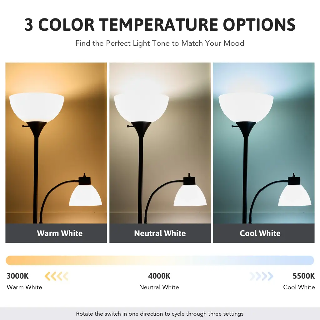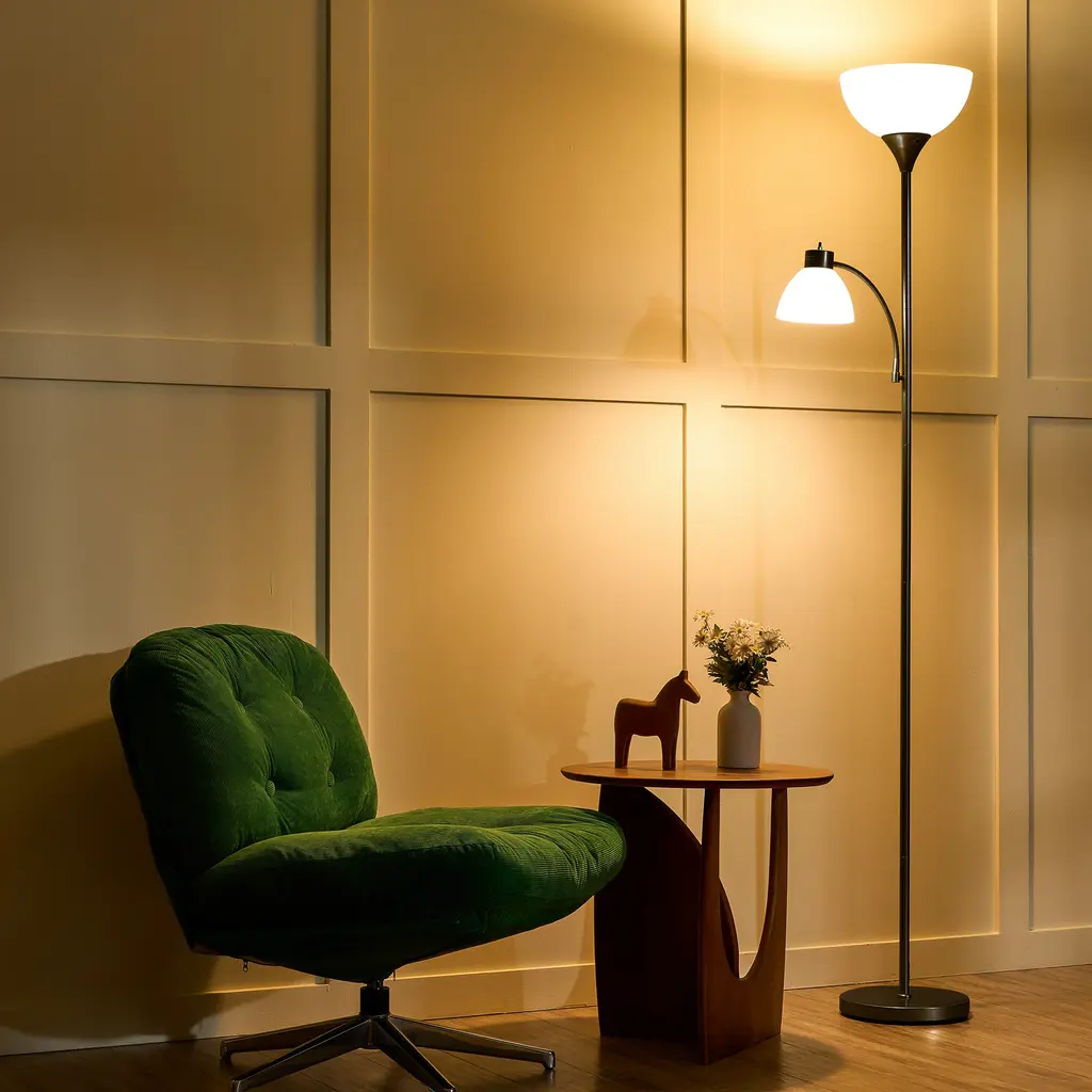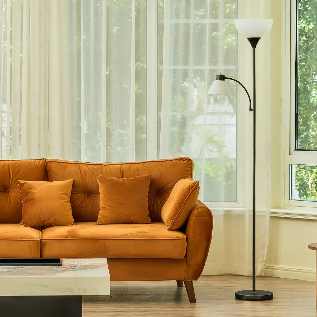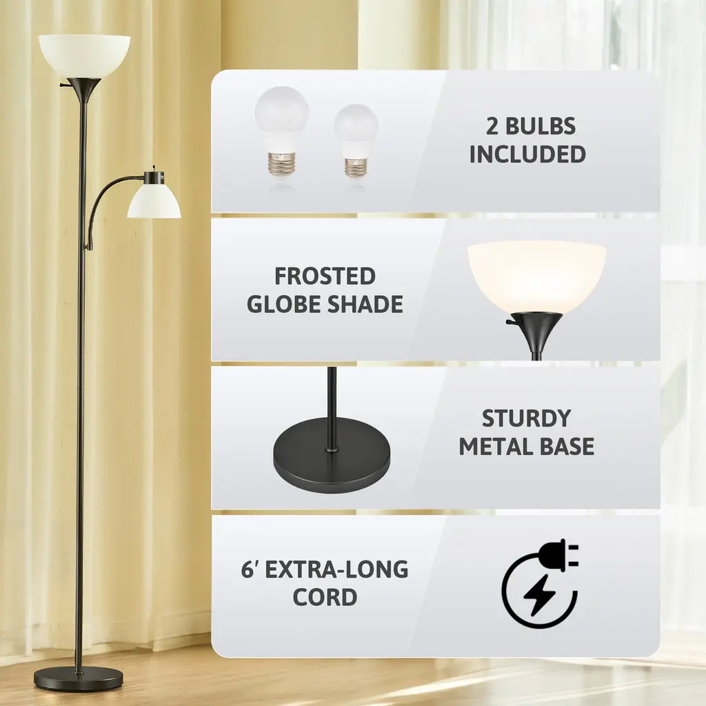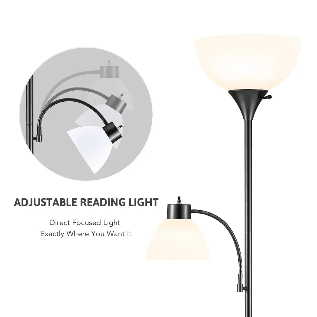Whether you want to brighten up a corner or add a practical decorative piece to your living space, this 71" torchiere floor lamp has you covered. The beautifully curved upper torchiere features a frosted white bowl shade that gently diffuses warm, ambient light, creating an inviting atmosphere perfect for relaxation or entertaining. Beneath it, the adjustable gooseneck reading lamp, adorned with a matching dome shade, provides focused illumination exactly where you need it—ideal for cozy reading nooks or workspaces. This exquisite lamp is more than just a lighting solution; it's a statement of style that enhances modern and transitional interiors alike.FeaturesDimensionsPackage List