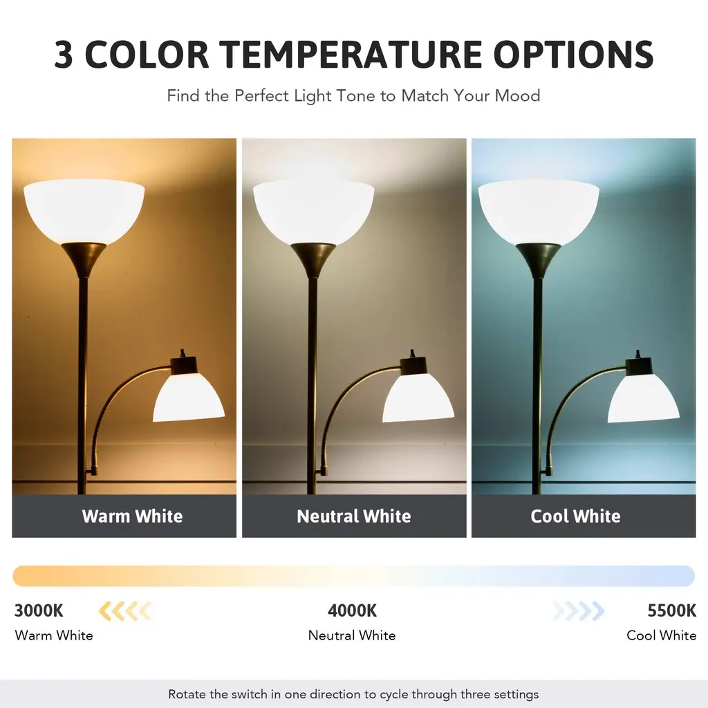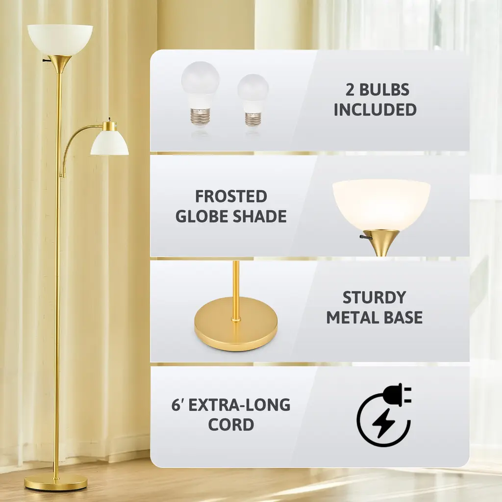 Whether you want to brighten up a corner or add a practical decorative piece to your living space, this 71" torchiere floor lamp has you covered. The beautifully curved upper torchiere features a frosted white bowl shade that gently diffuses warm, ambient light, creating an inviting atmosphere perfect for relaxation or entertaining. Beneath it, the adjustable gooseneck reading lamp, adorned with a matching dome shade, provides focused illumination exactly where you need it—ideal for cozy reading nooks or workspaces. This exquisite lamp is more than just a lighting solution; it's a statement of style that enhances modern and transitional interiors alike.FeaturesDimensionsPackage List