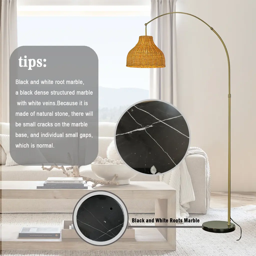 This arched floor lamp is made from metal in matte black or antique bronze finish and features a circular marble base with a slim body and arched top arm to create a slight semi-circle silhouette. The unique design of this brown rattan shade offers a natural cozy styling. Add a touch of the tropics, and a warm glow to any corner of your home with this charming floor lamp. A 7 ft. black cord allows you to place this Arc floor lamp wherever you need it most. Plus, this floor lamp has an in-line on/off foot switch that is user-friendly and eliminates the need to bend down. Perfect for setting beside couches, desks, or any cozy corners needing some extra light. FEATURE:✔ Bulb Type: 1 x Max 60W x E26 bulb(not included)✔ Overall product: W 43" x D 13.4" x H 75" ✔ Shade Size: D13"xH 10"✔ Shade Material: bohemian-inspired rattan shade✔ Color Type: matte black / antique bronze✔ Switch Type: foot switch✔ Black Cord Length: A 7 ft.