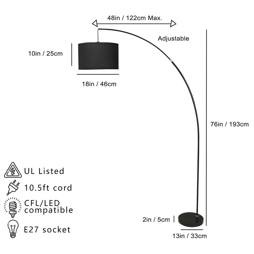 A floor lamp is the perfect blend of style and function, offering versatile lighting solutions for any room in your home. Whether you're looking to add ambient lighting to your living room, reading light beside your favorite chair, or an accent piece for your bedroom, a floor lamp provides both practical illumination and a touch of elegance.Boasting a brush silver finish, this lamp includes an adjustable arm for added versatilityStanding over six feet tall, this sophisticated lamp arching emits a pleasant light while tying the room together with its artistic presenceThe elegant white marble base provides stability for safe placement around children or petsArching brushed steel finished adjustable metal body. Overall: 78" heightFeaturing a hanging white fabric drum shade. Shade measures: 18" diameter by 10" height