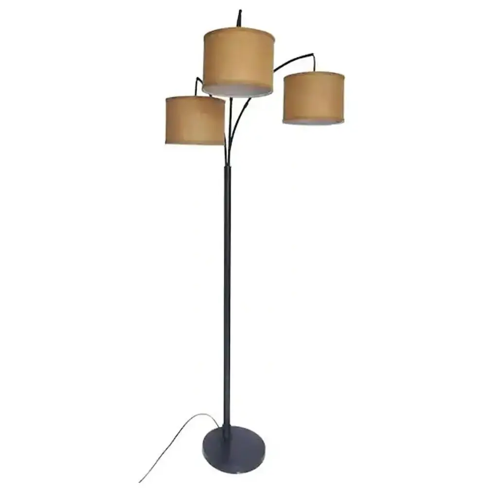 The antique bronze floor lamp has 3 burlap drum shades which suspend from adjustable curved metal poles. It has a rotary switch on pole and uses three 60-Watt incandescent bulbs or CFL equivalent (not included). It is 80 in. H. This lamp would bright up any room decor. Highlights Antique bronze finish Burlap fabric drum shades: 10 in. x 10 in. x 7.5 in. H Lamp overall height - 80 in. Sturdy metal base Easy to use 4-way rotary switch on pole Uses three 60-Watt bulbs (not included) Assembly required
