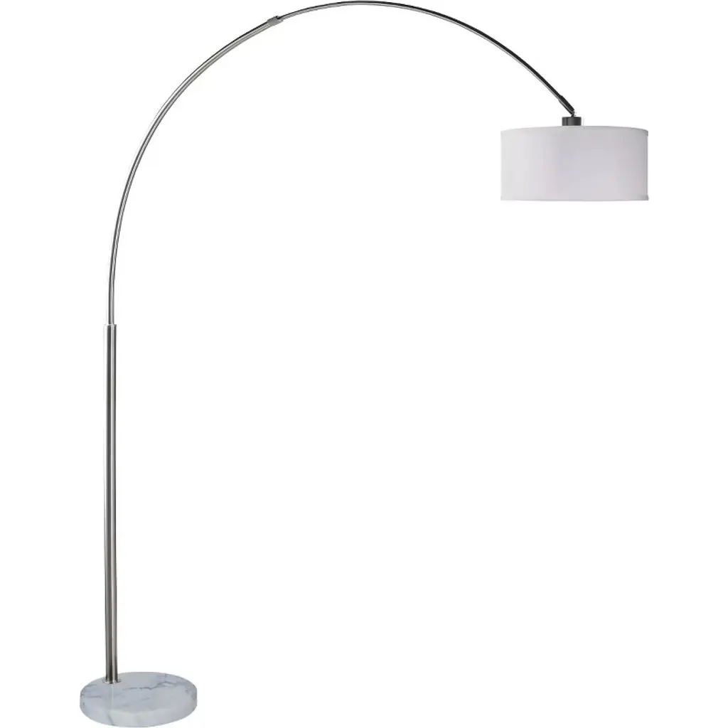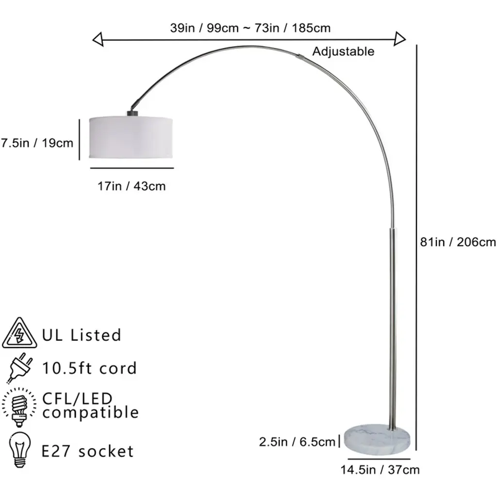 Standing over six feet tall, this sophisticated lamp arching emits a pleasant light while tying the room together with its artistic presenceEasy Press Foot SwitchThe elegant real white marble base provides stability for safe placement around children or petsArching silver brushed steel adjustable metal body. Overall: 81" height