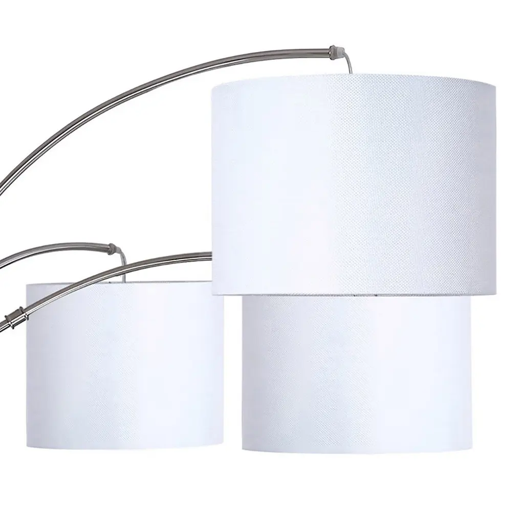 Add a bit of minimalist modern style to your space with this floor lamp by Grandview Gallery. The round base supports the lamp's slim metal body, which extends into three separate arched metal poles. At the end of each arc hangs a drum shade wrapped in lovely linen fabric. With its clearance of 66.5 inches, it easily rests behind the couch, next to a bed, in an the office, or even tucked into your favorite reading nook, making this floor lamp the stylish solution to your lighting needs. Floor lamp is 84" tall. Base is 13" wide. Three hardback drum shades: the first is 9" wide and 7" tall, the second is 10" wide and 7.5" tall, and the third is 11" wide and 8" tall. This lamp uses three 60-watt maximum "A" bulb and features an E26 socket with an on/off dimmer switch on its pole.