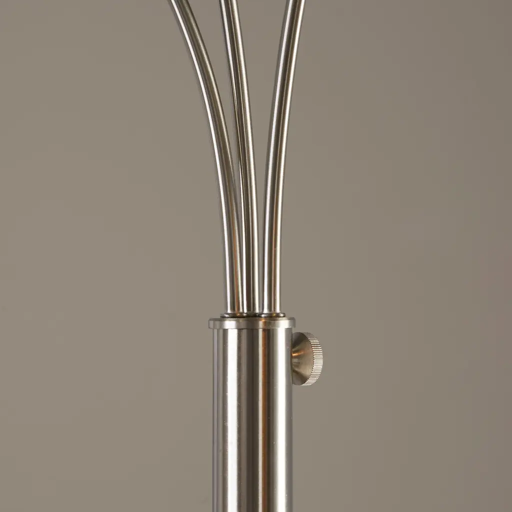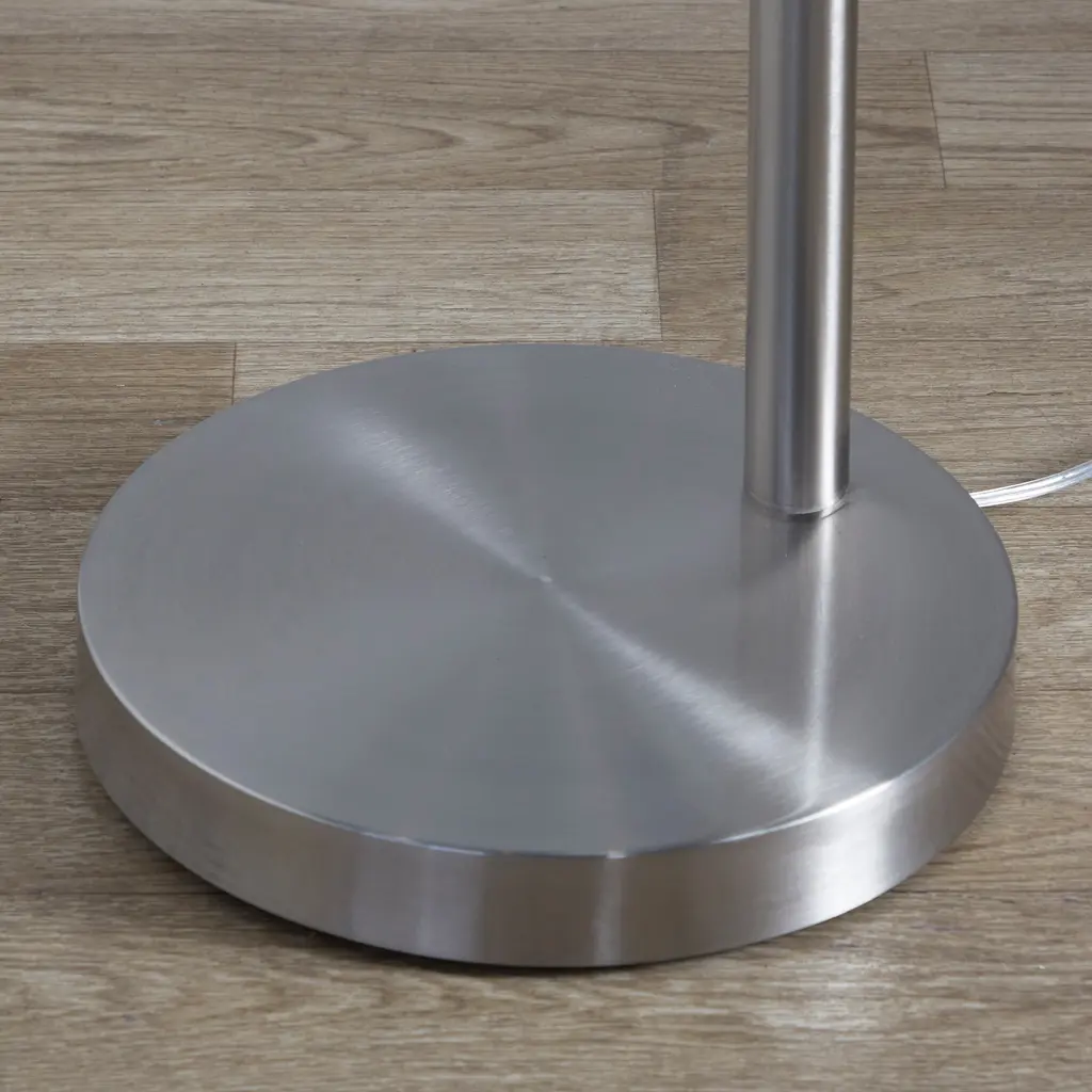 Add a bit of minimalist modern style to your space with this floor lamp by Grandview Gallery. The round base supports the lamp's slim metal body, which extends into three separate arched metal poles. At the end of each arc hangs a drum shade wrapped in lovely linen fabric. With its clearance of 66.5 inches, it easily rests behind the couch, next to a bed, in an the office, or even tucked into your favorite reading nook, making this floor lamp the stylish solution to your lighting needs. Floor lamp is 84" tall. Base is 13" wide. Three hardback drum shades: the first is 9" wide and 7" tall, the second is 10" wide and 7.5" tall, and the third is 11" wide and 8" tall. This lamp uses three 60-watt maximum "A" bulb and features an E26 socket with an on/off dimmer switch on its pole.