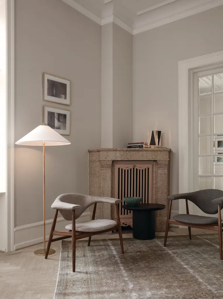 The 9602 Floor Lamp (1935), affectionately known as the “Chinese Hat," was designed by the Finnish lighting pioneer Paavo Tynell for the Hotel Aulanko. Featuring a crisply shaped lampshade, it stands on a textural rattan-covered stem and polished brass base. A polished brass accent atop the shade caps it off. Bulbs (not included): E26 base, 60W max. Made in China.