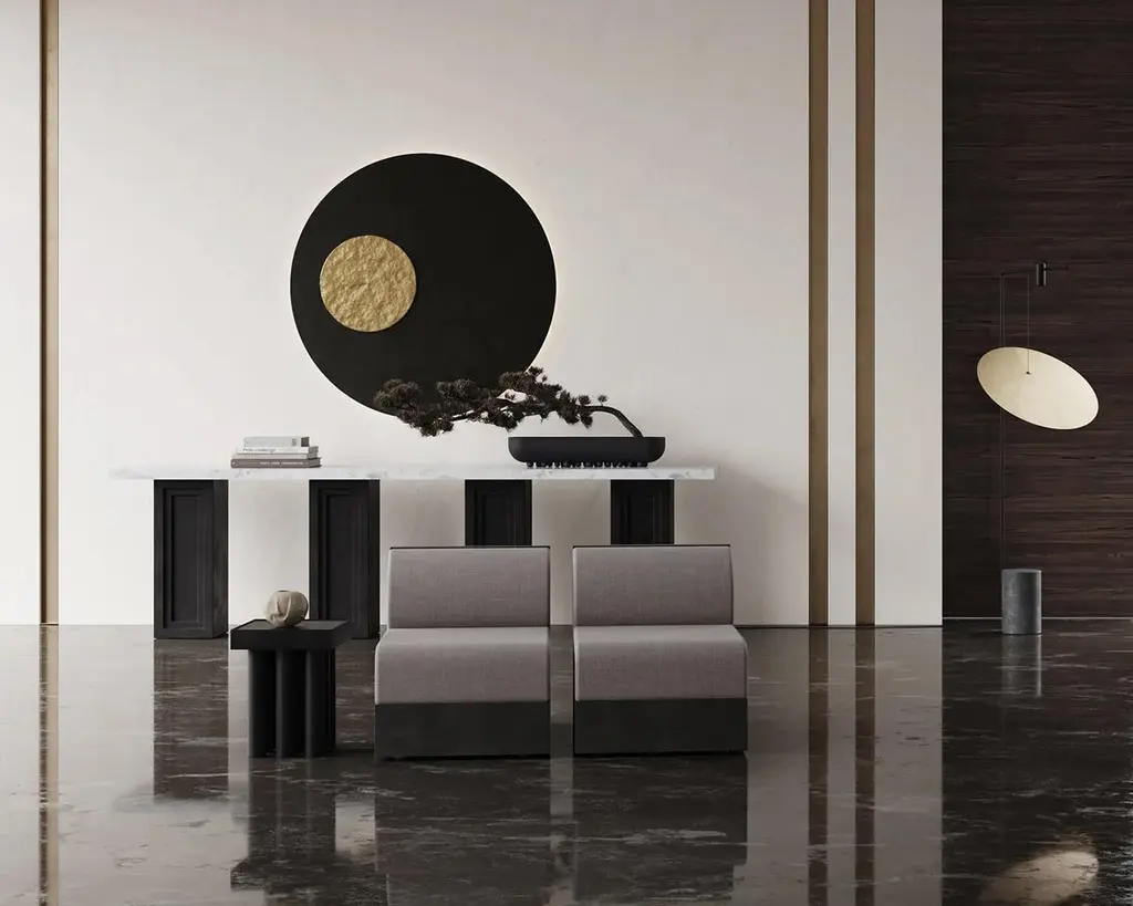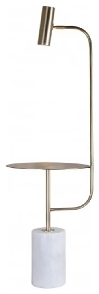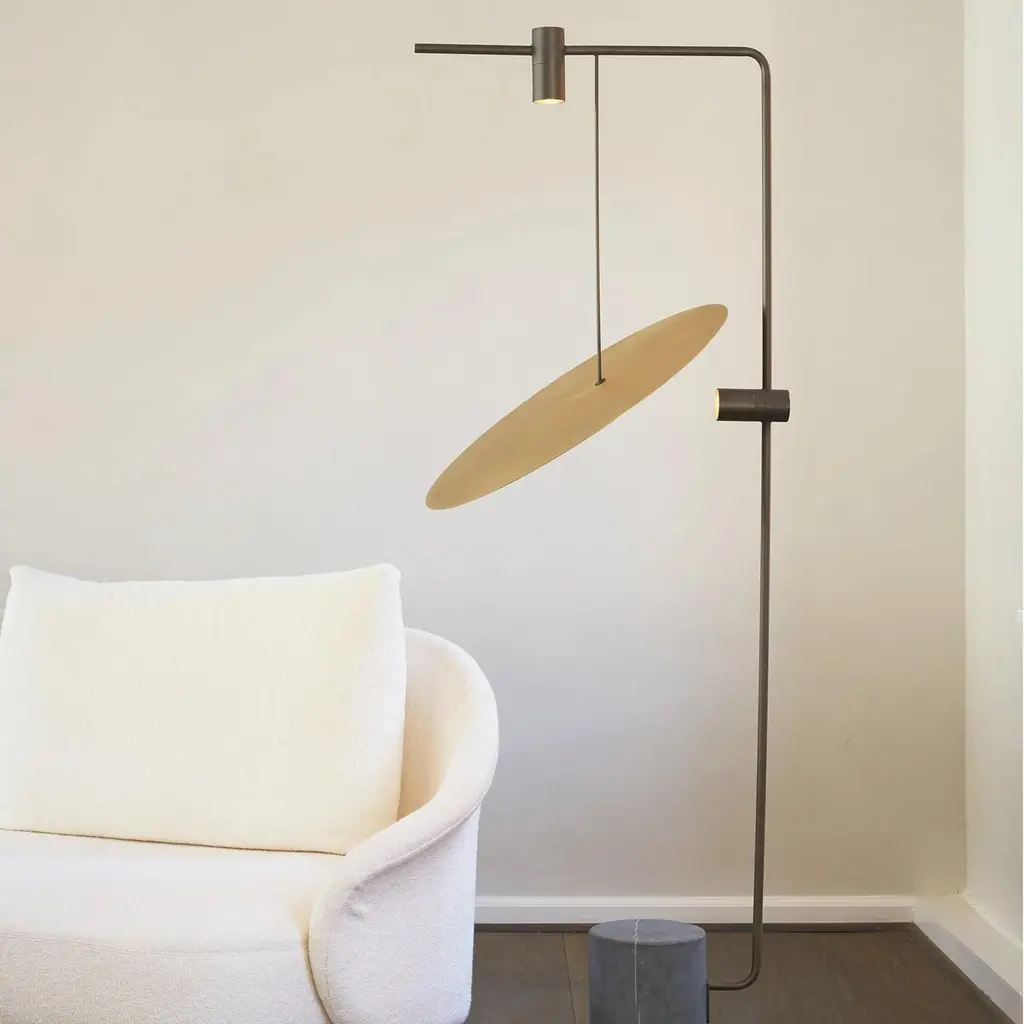 A contemporary iron and brass floor lamp. This minimalist floor lamp is constructed from geometric shapes, where each component is perfectly balanced with the others. The lamp has two light sources placed as fixed points of composition along an oxidised brass arm. A large circular shade hangs from the arm as a reflector floating in space. The brushed brass shade is lit from both sides. This contemporary floor lamp is mounted on a cylindrical base of rough grey marble, stabilising the structure. Colour / material:Metal: iron / brassPipes: brushed brassLampbase: MarbleCable: Fabric-covered cable with dimmer / blackDimensions:L: 63 cm / W: 65 cm / H: 188 cmCable length: 215 cmProduct weight: 33.8 kgRecommended light source: Pygmy - Matt porcelain - E14