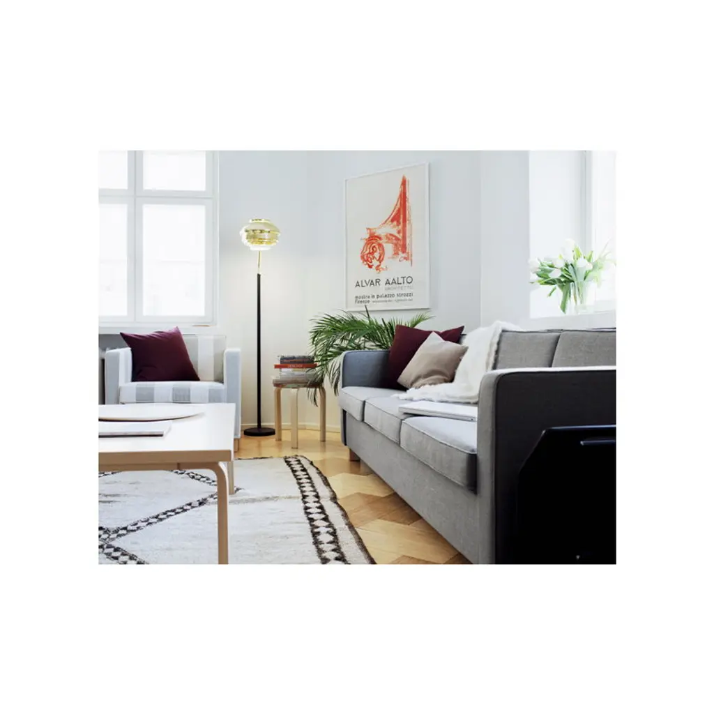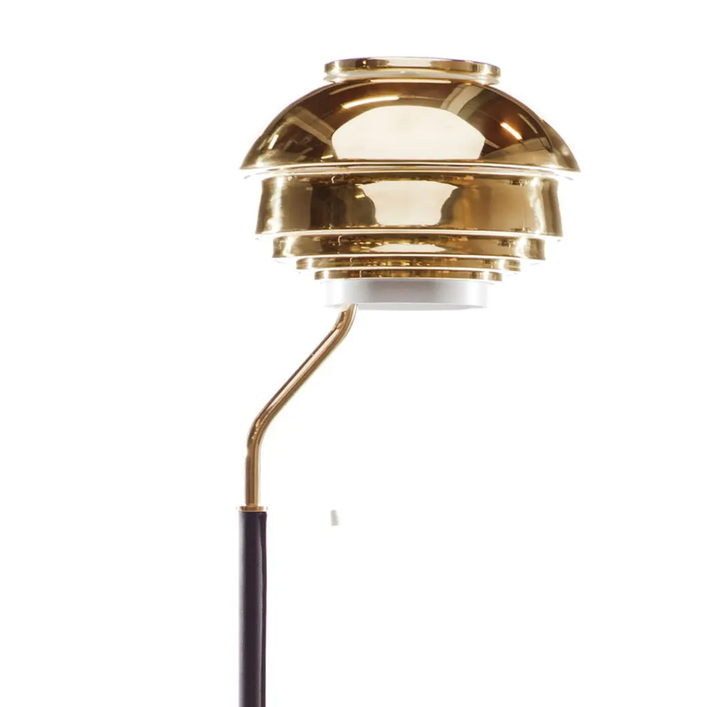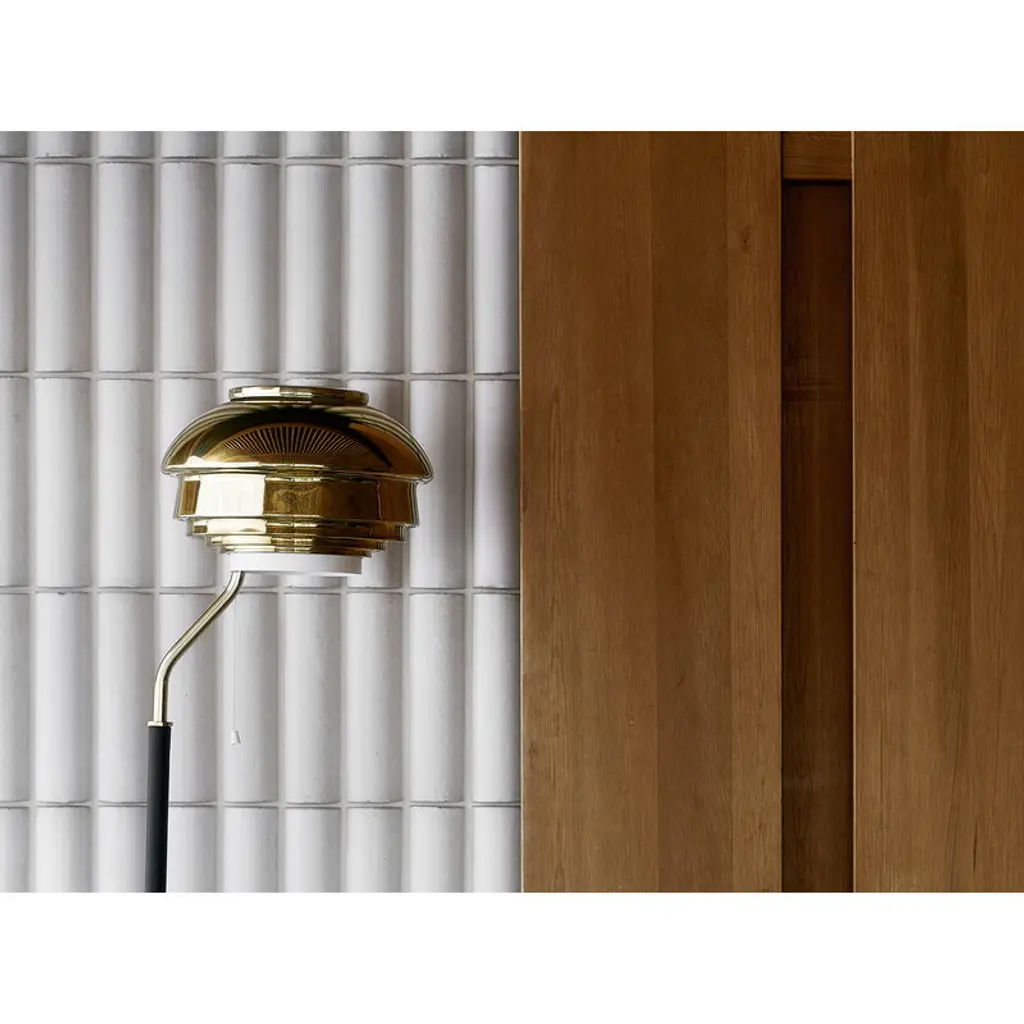 Artek’s A808 floor lamp is a well-balanced combination of different colors and materials: its leg features polished brass and black leather, and the shade is made of thin, layered brass strips that provide a smooth and warm light. Alvar Aalto designed the A808 lamp in 1955 for the National Pensions Institute of Helsinki, and its timeless elegance will easily complement modern homes and public spaces, too.