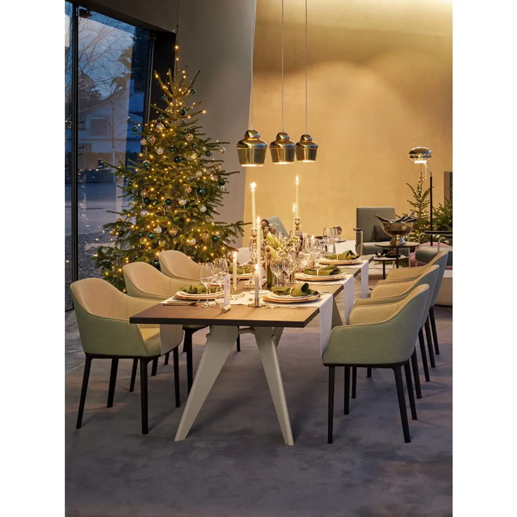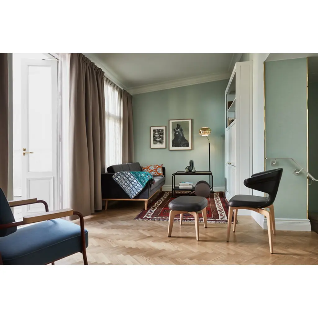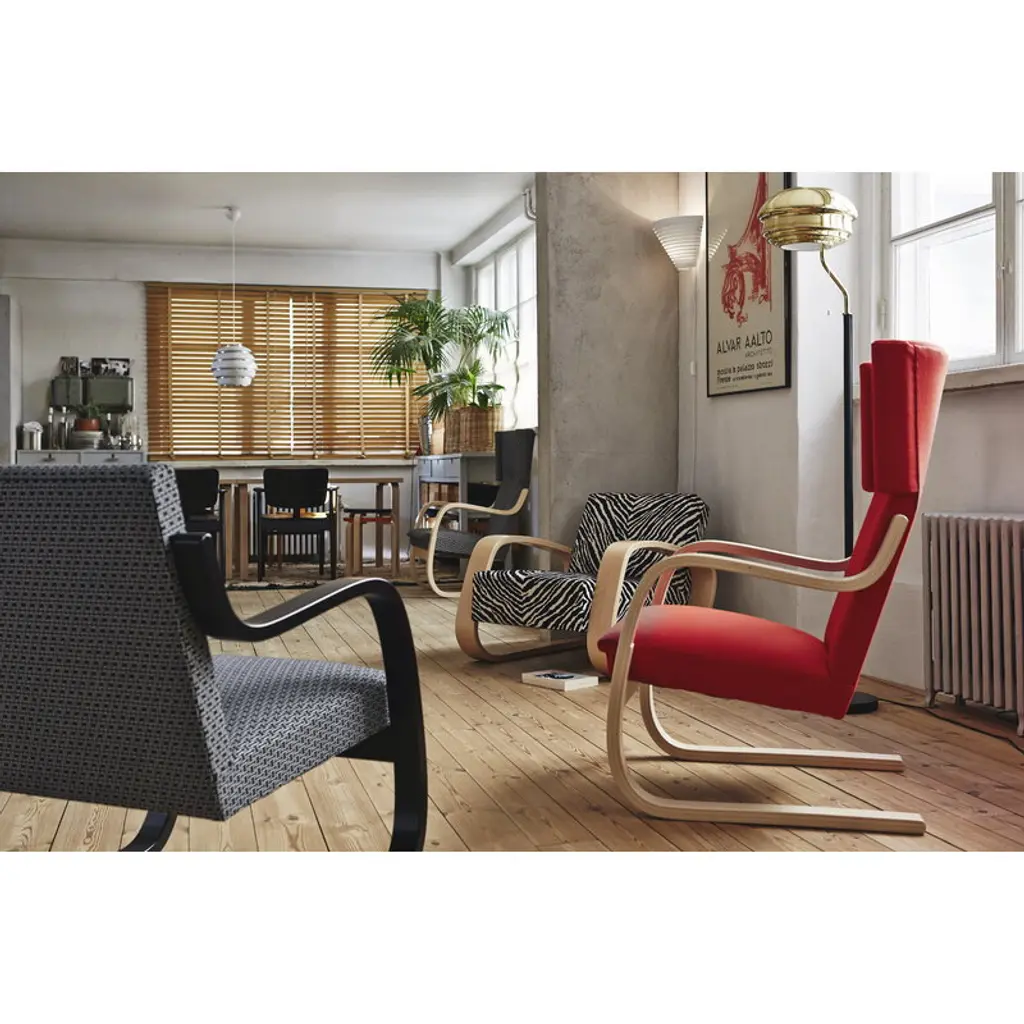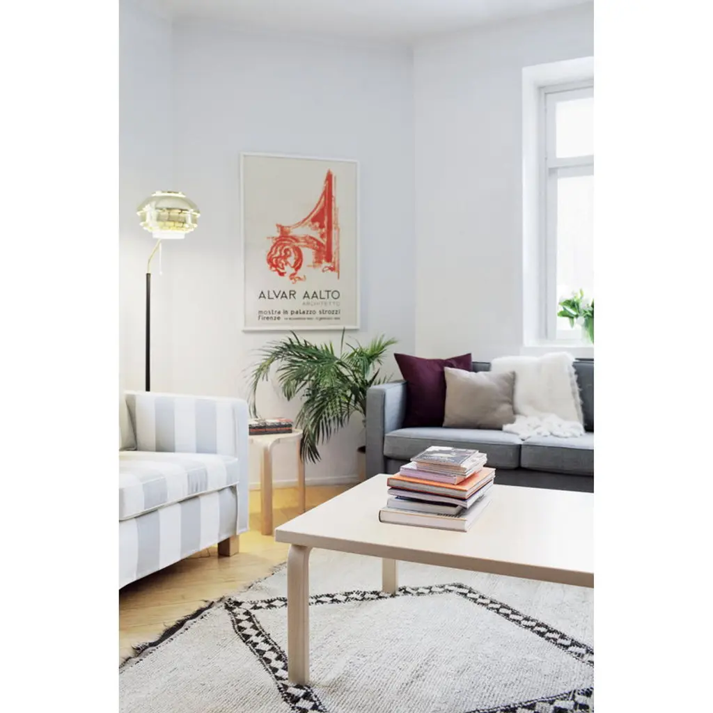 Artek’s A808 floor lamp is a well-balanced combination of different colors and materials: its leg features polished brass and black leather, and the shade is made of thin, layered brass strips that provide a smooth and warm light. Alvar Aalto designed the A808 lamp in 1955 for the National Pensions Institute of Helsinki, and its timeless elegance will easily complement modern homes and public spaces, too.