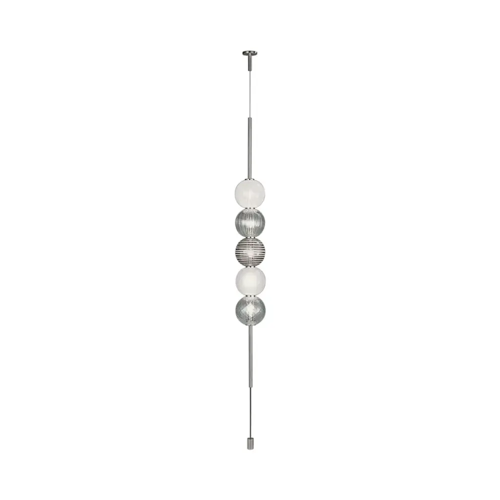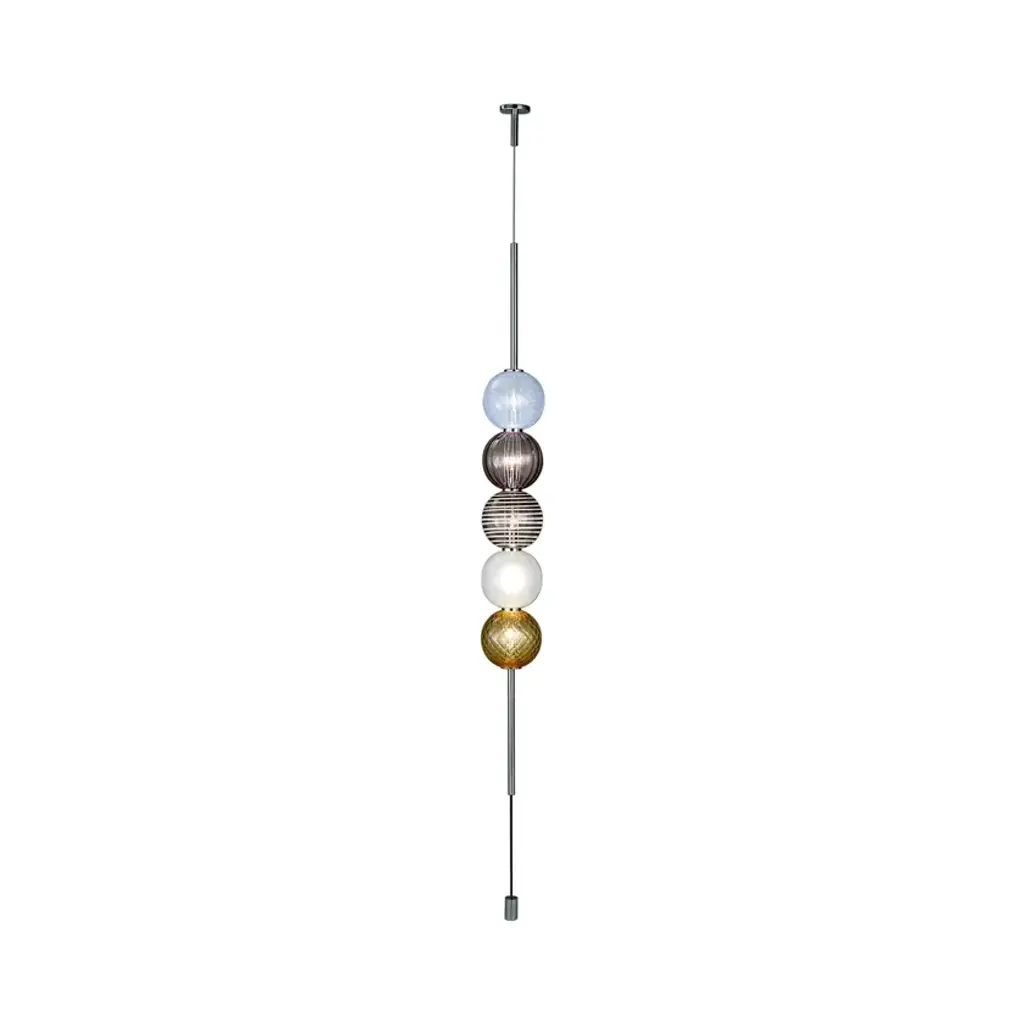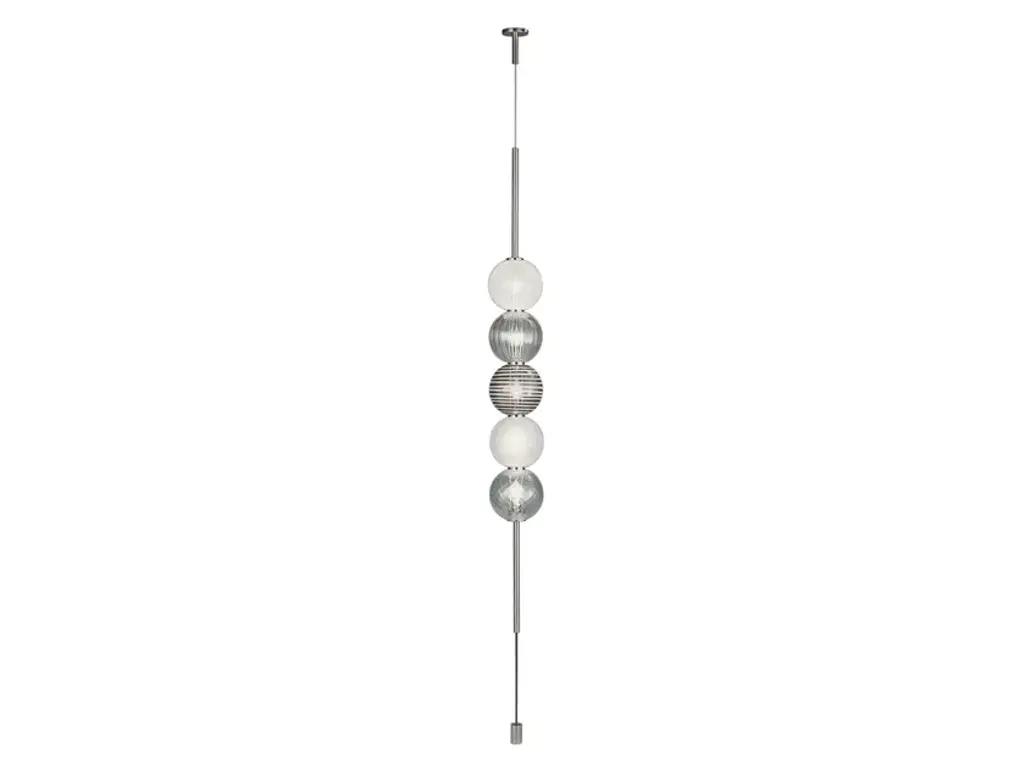 Abaco is a blown glass ceiling to floor lamp. Calculations, numbers, man’s endless attempt to rationalize an otherwise intuitive world. All this enclosed in a unique work by Monica Guggisberg and Philip Baldwin. Crafted with spheres of light, it is the utmost expression of beauty. Abaco is available as a pendant light, a wall light and a ceiling light.Colors:- MILK-WHITE filigree CRYSTAL / straight rigadin CRYSTAL / MILK-WHITE spiral MOLE / satin CRYSTAL / balloton CRYSTAL- BLUE filigree MILK / AMETHYST rigadin straight / MATT spiral MILK-WHITE / satin CRYSTAL / AMBER ballotonLight source:823.00 5 lights - 5 x max 8W LED E14 - Dimmer823.06 5 lights - Electrified from above - 5 x max 8W LED E14“ One the one hand, the sphere: the most ubiquitous form in the known universe. On the other, mathematical calculation: counting, numbers, man’s endless attempt to rationalize an otherwise intuitive world. But nevermind this the spheres exude light, the source of intelligence, heated expression, and beauty”.(Monica Guggisberg, Philip Baldwin)