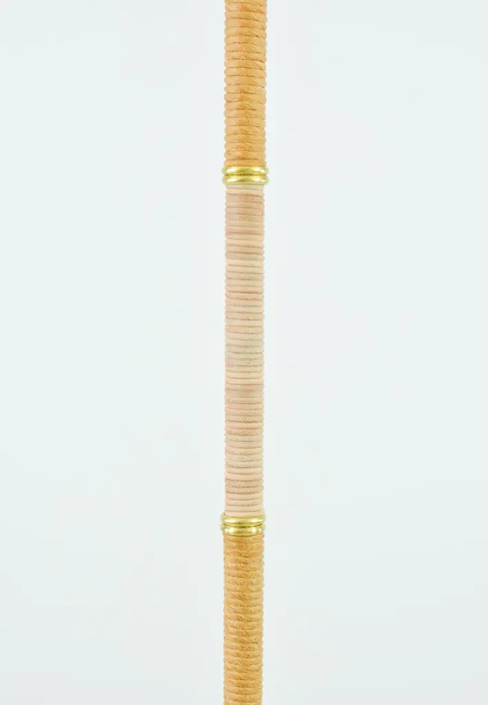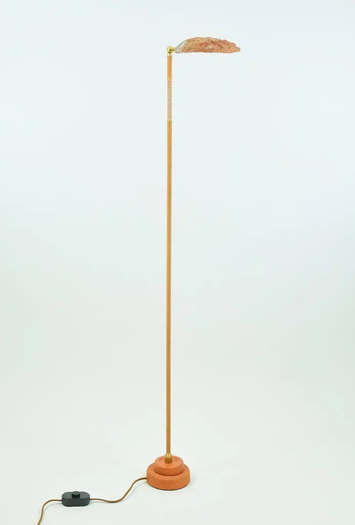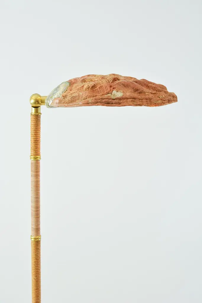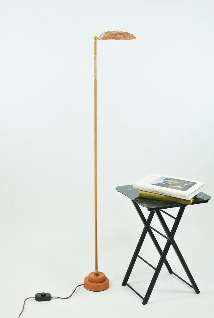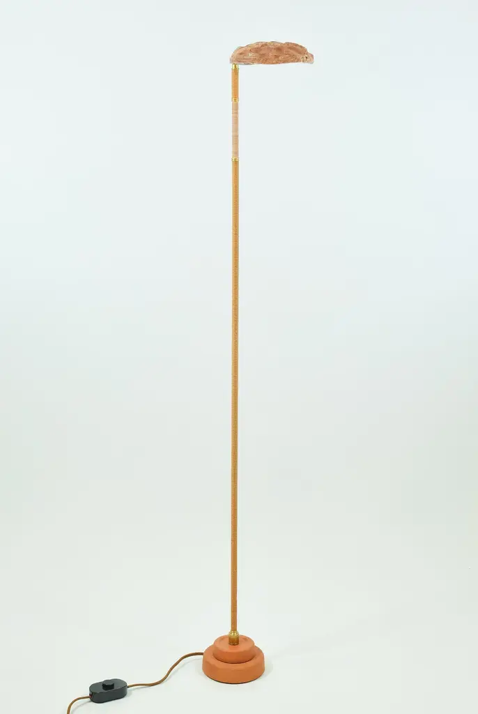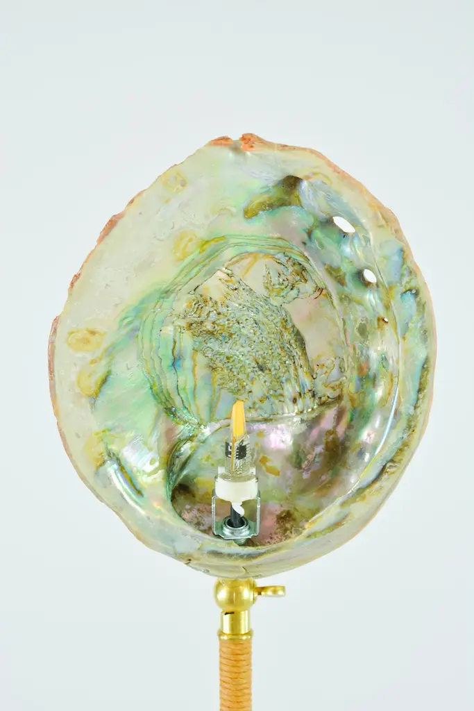 “Venus favors the bold.” —OvidThe Abalone Library Lamp is the 11th release from the Venus Collection, a whimsical family of handmade fixtures inspired by the Surrealists and natural forms of the sea. Employing the latest advances in cool-to-the-touch LED technology, the collection features table lamps, floor lamps, and sconces made with hand-selected specimen seashells in place of traditional shades, putting the organic source material behind so much 20th century modernism front and center.Model No. 034 was designed to pair well with the Abalone Lawyer's Lamp, but looks equally smart on its own.Standing 53.5” tall, it consists of a graduated base composed of two terra cotta-tinted cast-plaster discs, a hand-wrapped papercord-and-leather column, and a cantilevered shade crafted from a rare, upcycled vintage Red Abalone seashell with a green-hued, mother-of-pearl interior, sourced from a California collector. Fully adjustable heavy-duty swivels at the top and bottom of the column allow for fine-tuning of the shade angle and overall silhouette. Unfinished brass hardware, a khaki cloth-covered cord, 1940s-style plug, and Bakelite push-button switch complete the elegant profile of this hard-working, all-natural beauty. Made-to-order by hand in a signed and numbered277 edition of three by Christopher Tennant. Need something a bit more bespoke? Drop us a line.