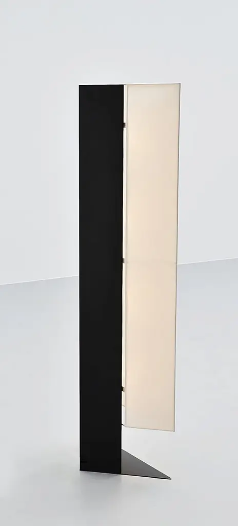 The Accademia lamp, designed by Cini Boeri in 1978, is a floor lamp version of the popular table lamp created for Artemide. This lamp is an impressive example of Boeri's minimalist approach to design, with its elegant and refined aesthetics expressed through geometric shapes and a timeless combination of black and white. These lamps are from a new old stockIf you are an architect or interior designer, there is the possibility that we can have some more pieces of this model from a private collectionThe structure of the Accademia lamp is based on a triangular form, constructed with textured black lacquered steel. This choice of material not only provides strength and durability to the lamp but also adds a touch of elegance and modernity to its appearance. The triangular geometry offers an interesting visual balance and a sense of stability.The lamp's diffuser is made of off-white cotton fabric. This soft and delicate material allows the light to filter smoothly and evenly, creating a cozy and warm atmosphere in any space where the lamp is placed. The use of an off-white tone contributes to maintaining the purity and simplicity of the overall design.The Accademia lamp features two E-14 lamp holders, providing an efficient and versatile light source. This allows for adjusting the brightness according to individual needs and preferences. Additionally, the lamp is equipped with a switch located on the cord, making it easy to handle and control.In summary, the Accademia lamp by Cini Boeri, is an iconic design that encapsulates the Milanese architect and designer's minimalist vision. With its textured black lacquered steel triangular structure, off-white cotton fabric diffuser, versatile lamp holders, and elegant switch on the cord, these lamps combine functionality and style in a harmonious form. They are perfect choices for those seeking sophisticated and contemporary lighting in their home or office, adapting to different space sizes according to their needs.