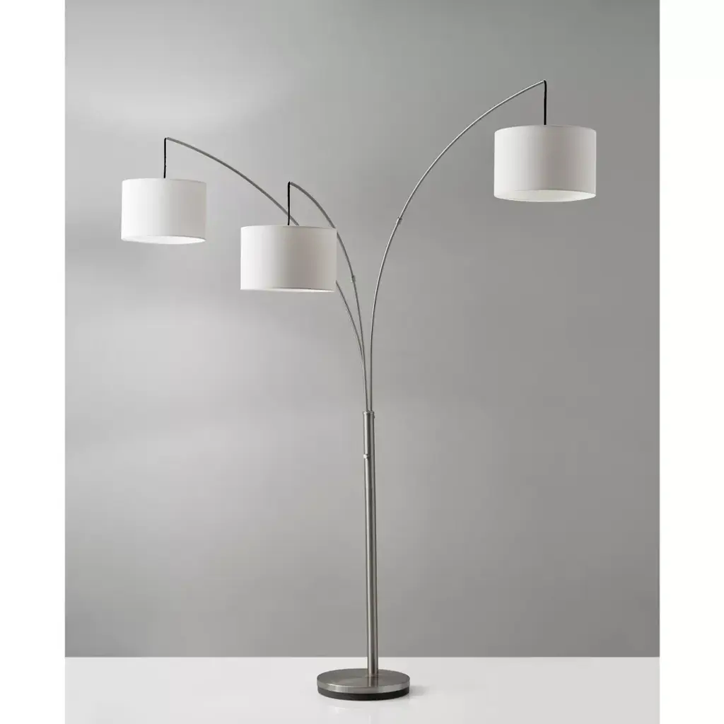 The contemporary Trinity Arc Lamp presents a stylish alternative to the typical arc lamp. A trio of white drum shades are suspended from brushed steel arms and controlled with a four-way rotary switch on the main pole. Three 100W incandescent bulbs or equivalent CFL's provide enough light to brighten an entire room. This lamp has a clear cord and is smart outlet compatible. Bulbs are not included.
