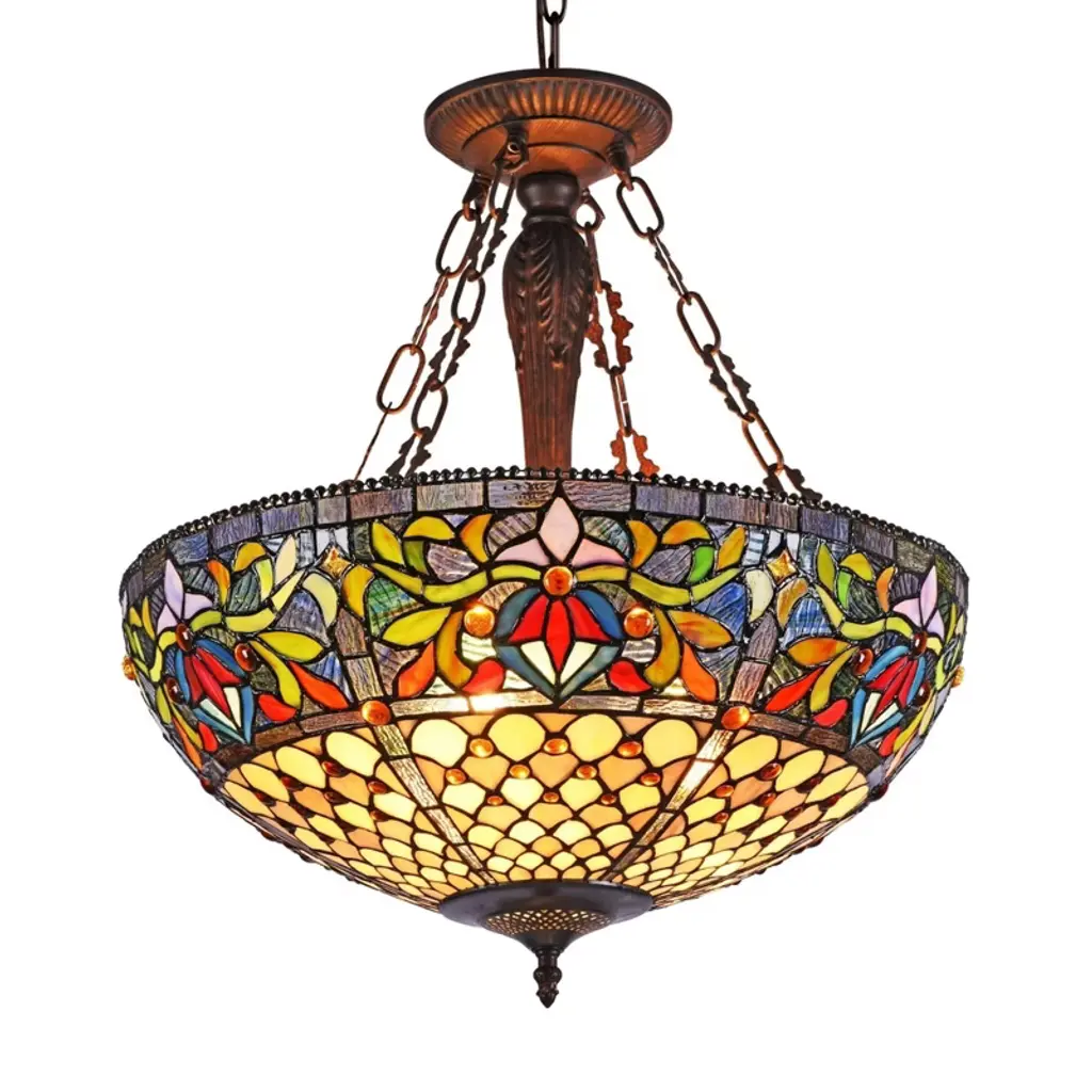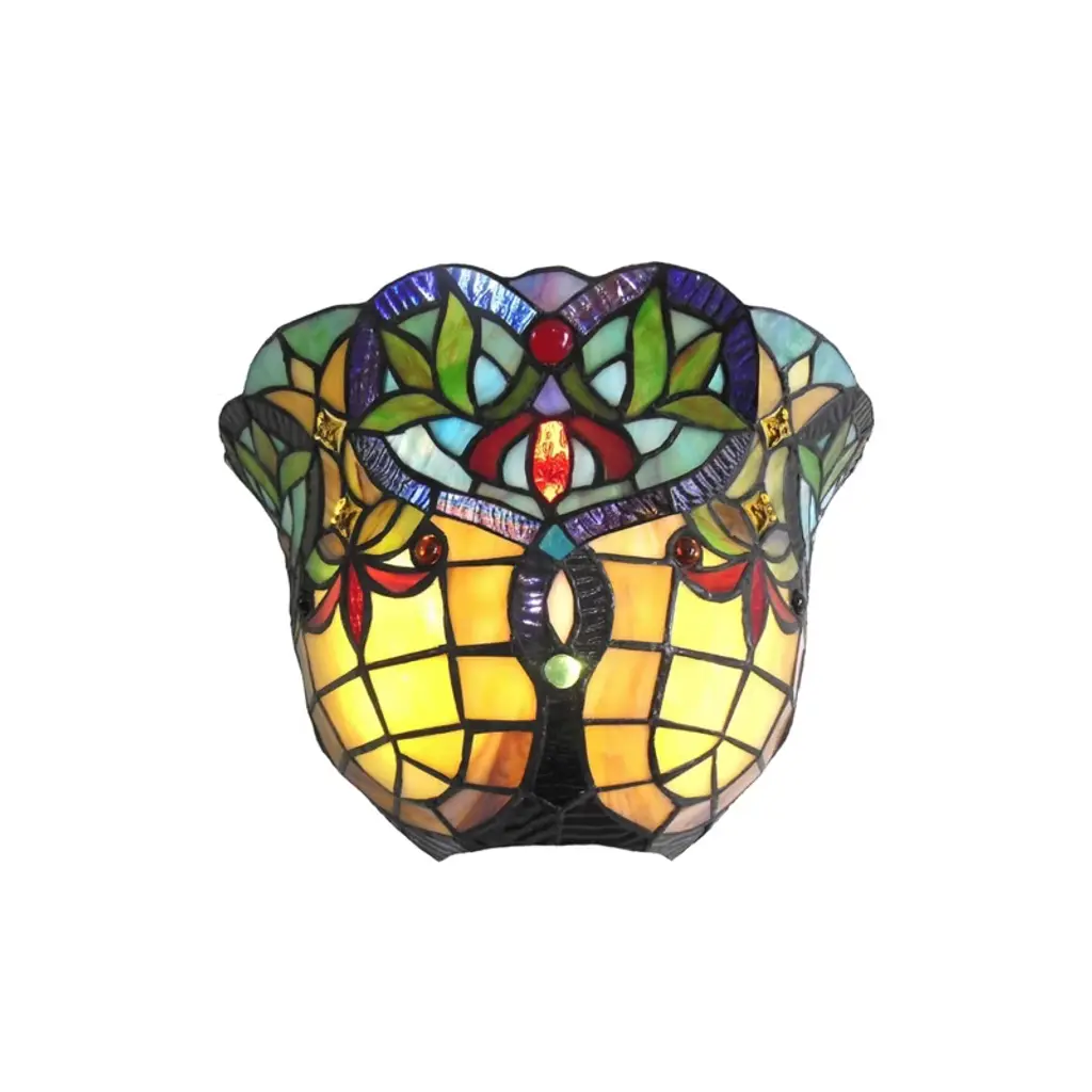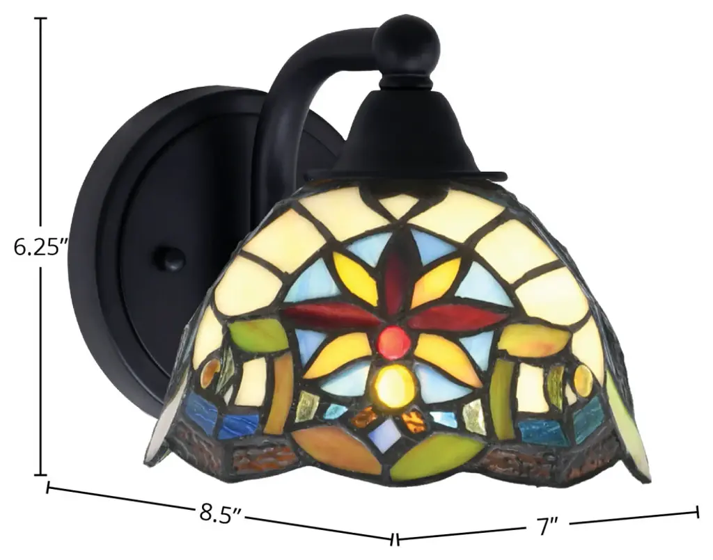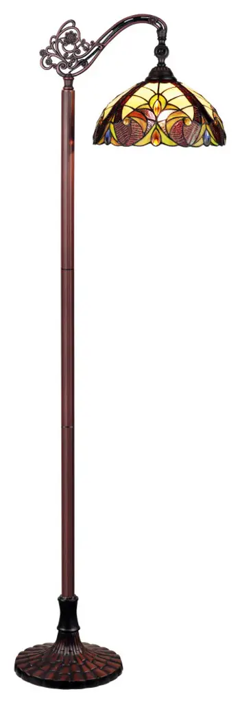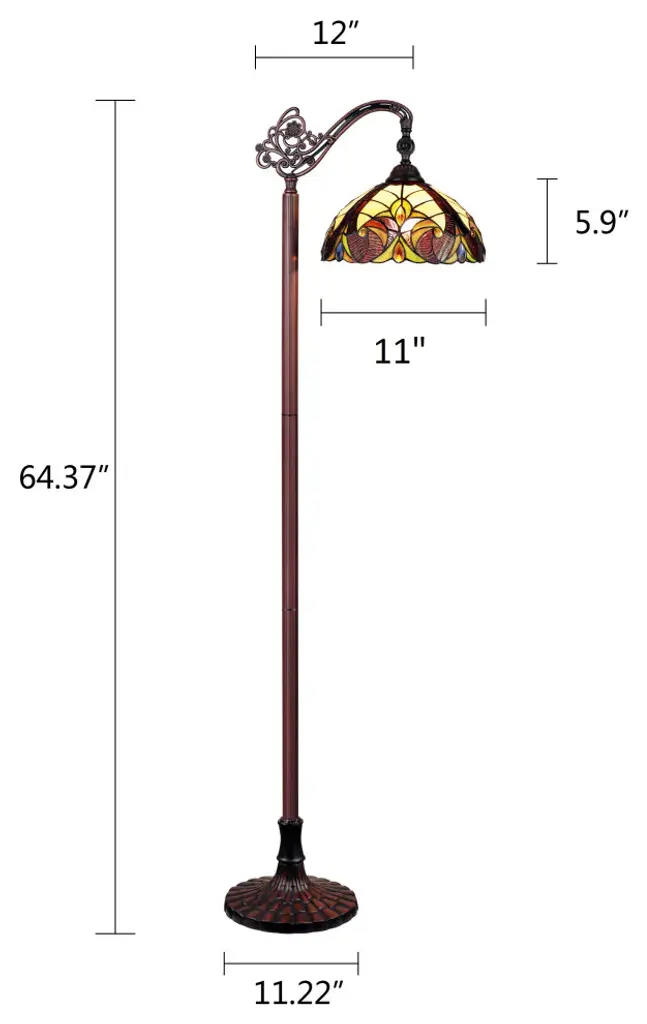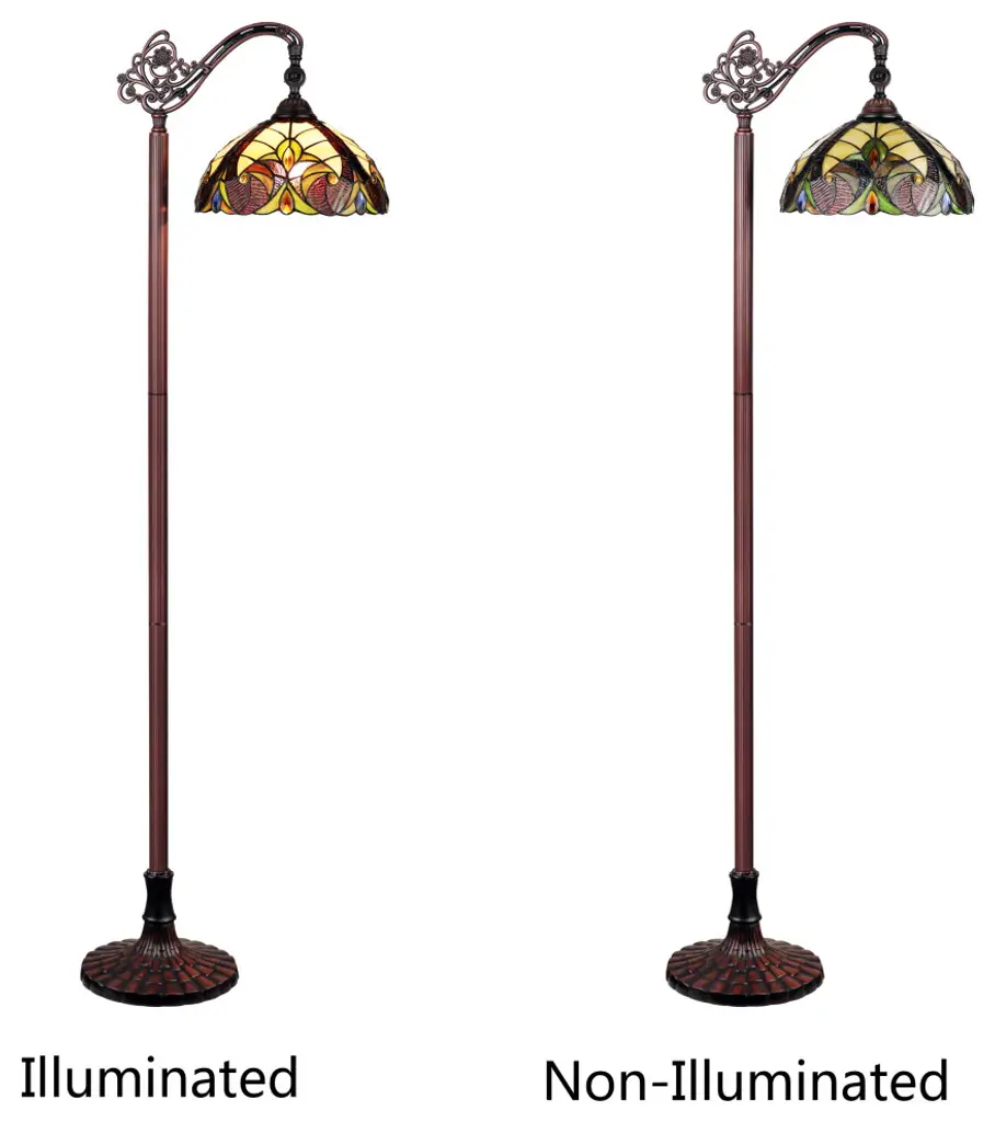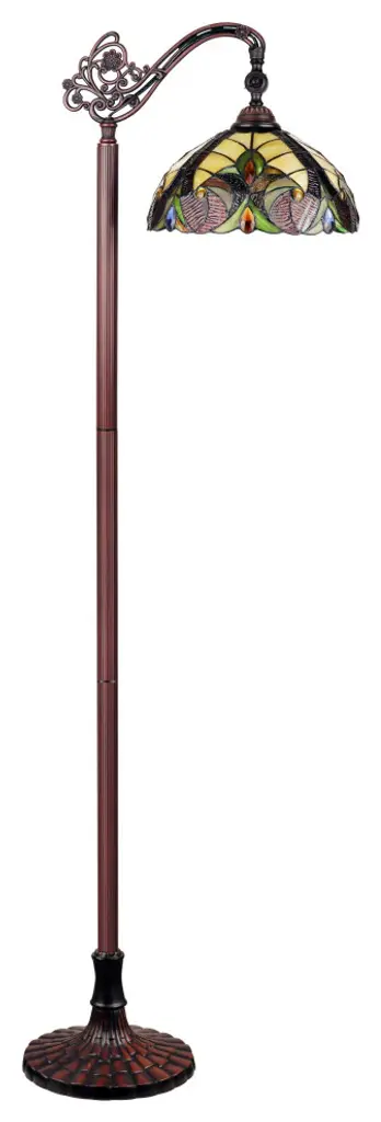 Adia is a beautiful, stained glass reading floor lamp in a traditional Victorian style, featuring a detailed base and a foot switch. This lamp would be perfect in a bedroom, living room, and dining room. The shade is hand-crafted, using the same methods developed by Louis Comfort Tiffany in the early 1900''s. This process entails using 168 hand-cut stained art glass pieces and 20 glass beads, each wrapped in fine copper foil and soldered together at extremely high temperatures to form each unique piece. Exact size to the nearest inch may vary, and exact color of each glass piece may vary due to each piece being hand crafted. First image is with the light shining through, second image is with no light. Dry listed and recommended for an indoor setting.