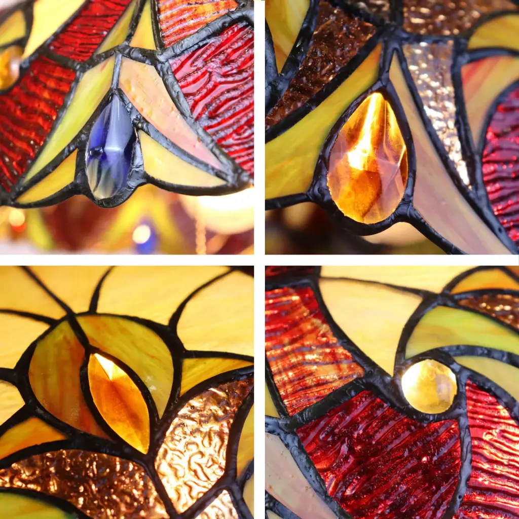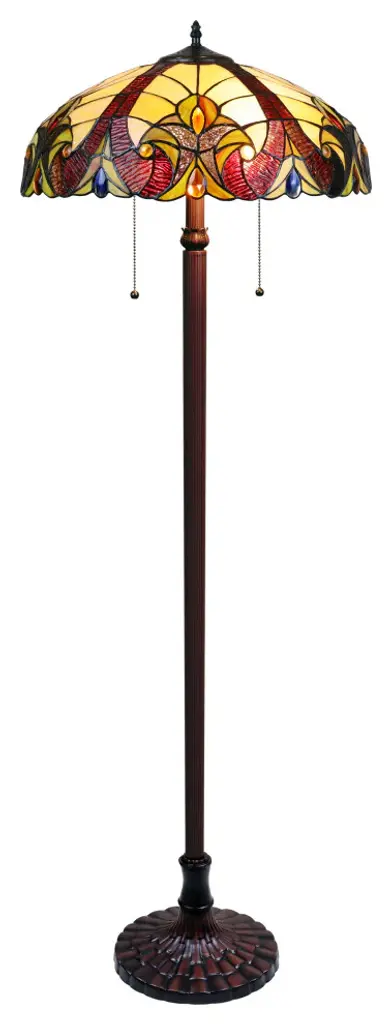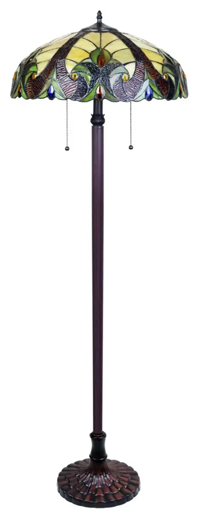 Adia is a beautiful, stained glass floor lamp in a traditional Victorian style, featuring a dark bronze base and 2 pull chains switches. This lamp would be perfect in a bedroom, living room, and dining room. The shade is hand-crafted, using the same methods developed by Louis Comfort Tiffany in the early 1900''s. This process entails using 264 hand cut stained art glass pieces and 30 glass beads, each wrapped in fine copper foil and soldered together at extremely high temperatures to form each unique piece. Exact size to the nearest inch may vary, and exact color of each glass piece may vary due to each piece being hand crafted. First image is with the light shining through, second image is with no light. Dry listed and recommended for an indoor setting.