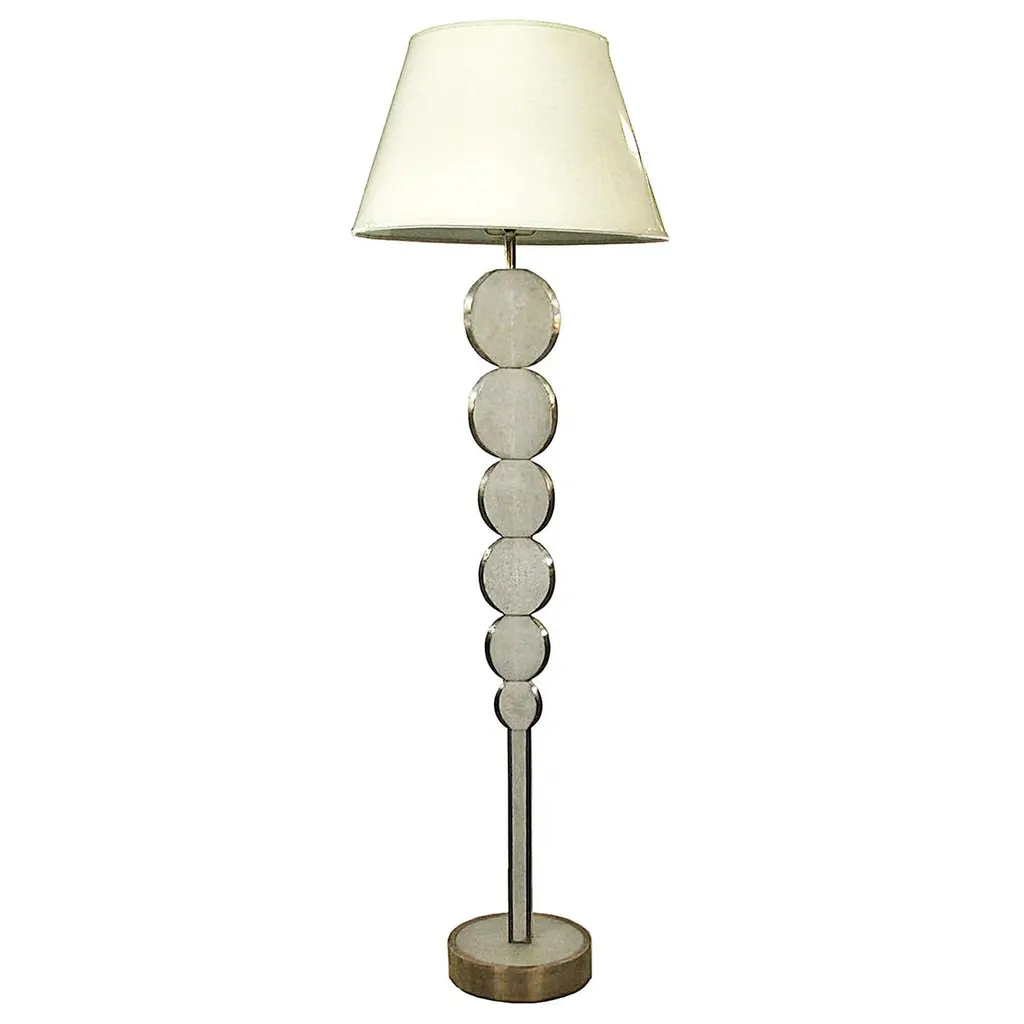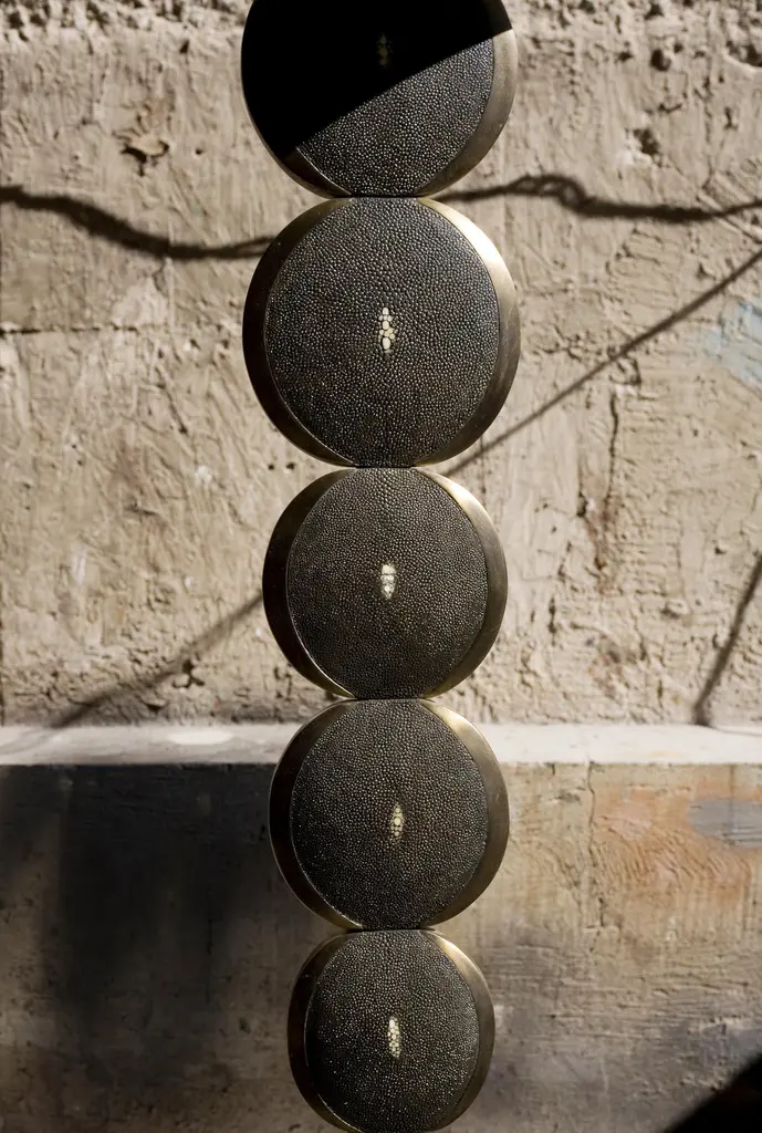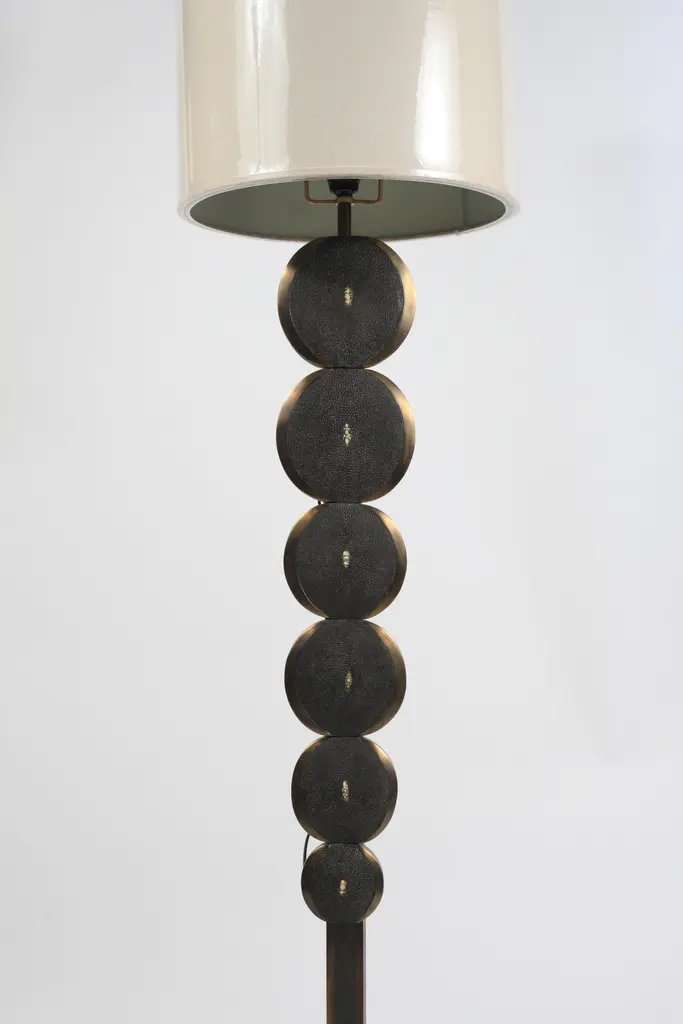 The Paris based label has distinguished themselves since their launch, with their iconic use of shagreen mixed with brass and other exotic materials. All furniture is handcrafted by skilled artisans, ultimately making each piece unique, designed in Paris and produced in the Philippines.This adjustable floor lamp in coal black Shagreen and bronze patina brass by R&Y Augousti is a sculptural piece with beautiful inlay detailing. This floor lamp features circle parts that gradually increase and are inlaid with a bronze-patina brass frame. The back fixture allows for the height of the floor lamp to be adjusted. Shade included. Available in a cream shagreen version pattern, image at end of slide. The dimensions of this piece are 58 x 58 x 178 cm / 23" x 23" x 68"All R&Y Augousti pieces are handmade by artisans, ultimately making each piece unique. Custom color/sizing available on request. Wipe clean with soft dry cloth.Acclaimed design duo Ria & Yiouri Augousti have established themselves since the 1990s as pioneers of modern-vintage style through their luxurious Art Deco inspired collections.The Paris based label has distinguished themselves since their launch, with their iconic use of shagreen mixed with brass and other exotic materials. All furniture is handcrafted by skilled artisans, ultimately making each piece unique. All shagreen-covered items should be kept out of direct sunlight, color variants may occur on the stingray and other exotic finishes, but this showcases the Parisian label's commitment to creating authentic luxurious products using natural components.