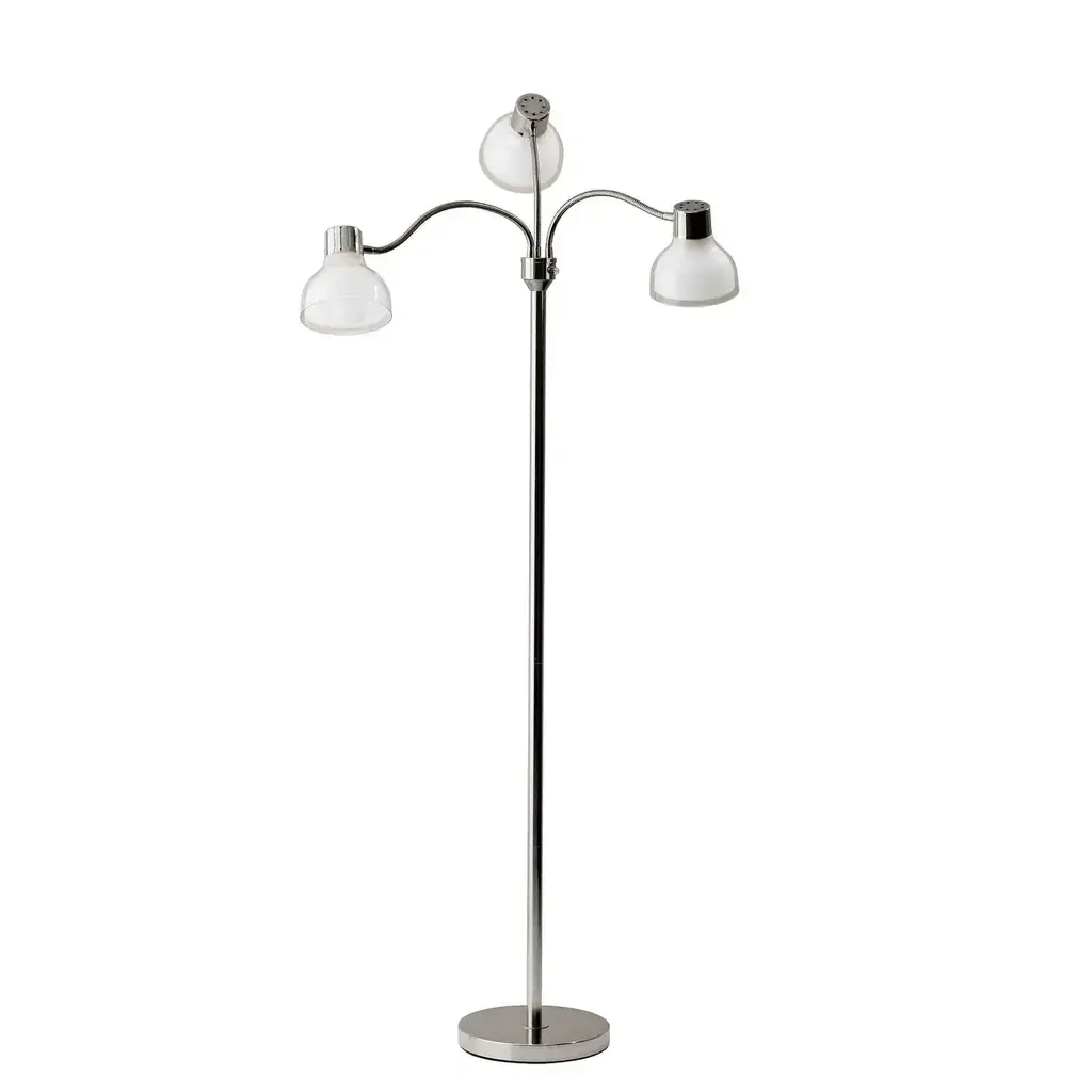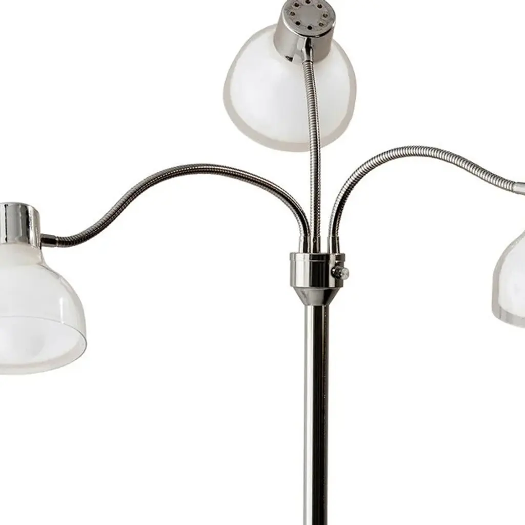 Enhance your bedroom or living room with this 3-Arm Floor Lamp. A simple, yet functional style updated with a polished nickel finish and a unique shade construction. A clear plastic outer shade covers a frosted inner shade creating a beautiful glow when lit. Three adjustable gooseneck arms conveniently bring the light to wherever it is needed. This floor lamp can function as both an ambient light source for a large living space or directive task lighting for a workspace. A rotary switch on the pole adjusts the light to 3 different settings: 1 light on, 2 lights on, all lights on, and off. This lamp is smart outlet compatible and has a clear cord. Bulbs are not included.