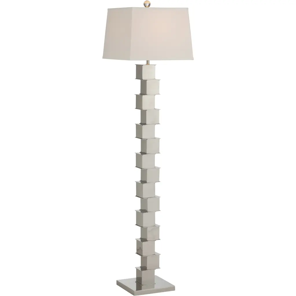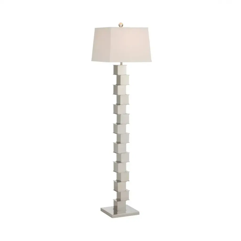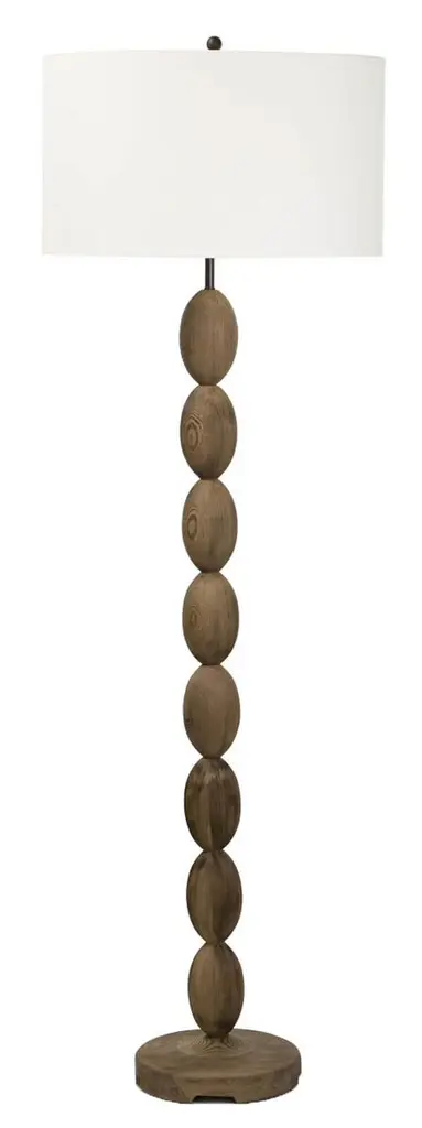 Elongated blocks carved from distressed Mangowood are spaced along an iron stand to create the base of the Adonis floor lamp. Petite black faux plaster finished iron blocks separate the wood blocks along the body. The pinnacle of the Adonis lamp reveals a black plaster finial over a natural linen shade.